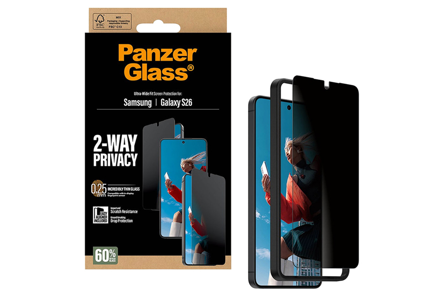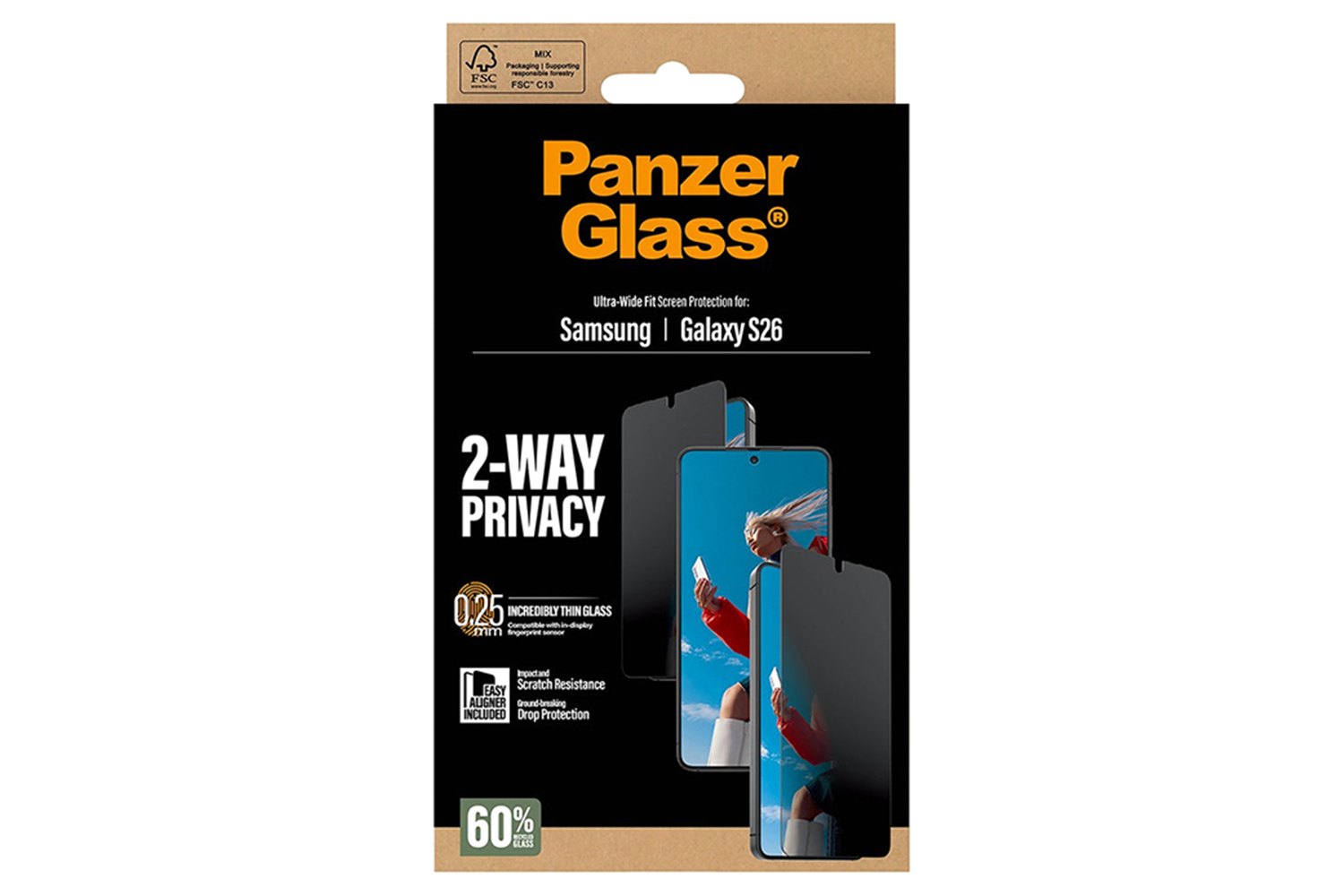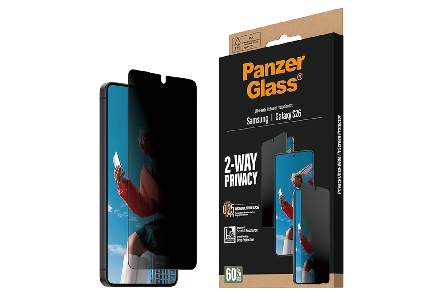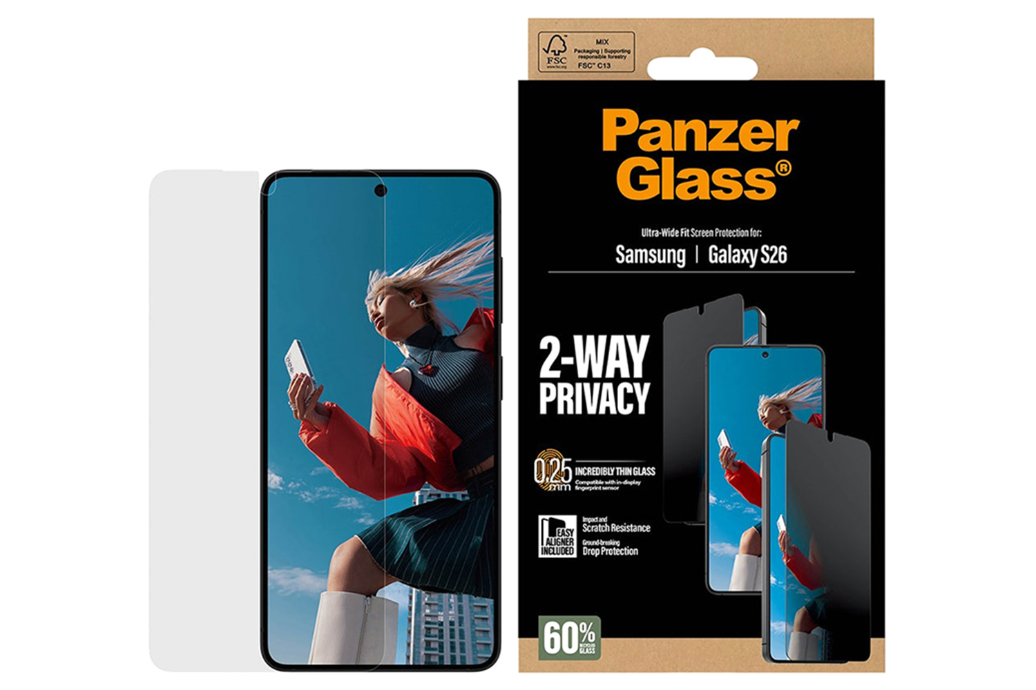 And the screen protection? It’s outstanding! With high-level scratch resistance, this screen protector shields your phone screen from accidental bumps, crushing falls, and other hazards of everyday life. Or to put it in more sustainable terms: It prolongs the lifetime of your phone, postponing the need to produce new phones. This is one way of working toward a more sustainable future. Another is to use less packaging: In 2024, PanzerGlass reduced the amount of paper in the PanzerGlass core product packaging design by an average of 66%*. So, of course, this product comes in a recyclable FSC-certified box.