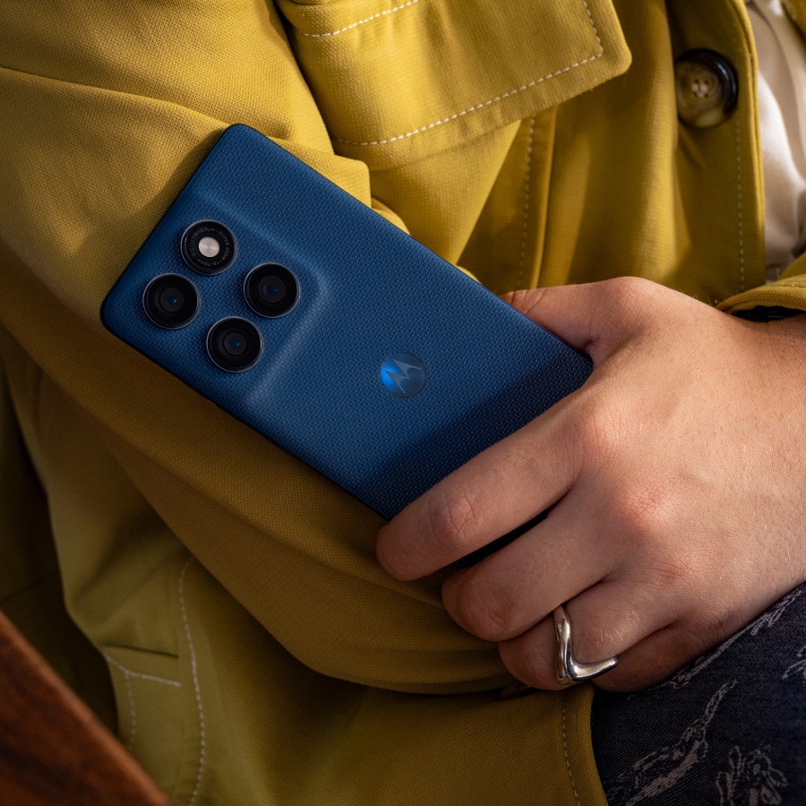 The harmonious quad-curve design blends front and back glass for a smooth feel, free of sharp edges. motorola edge 60 is built with four layers of glass fibre, making it both stylish and durable. Finished in leather and canvas-inspired textures, it offers a premium touch with lasting strength.