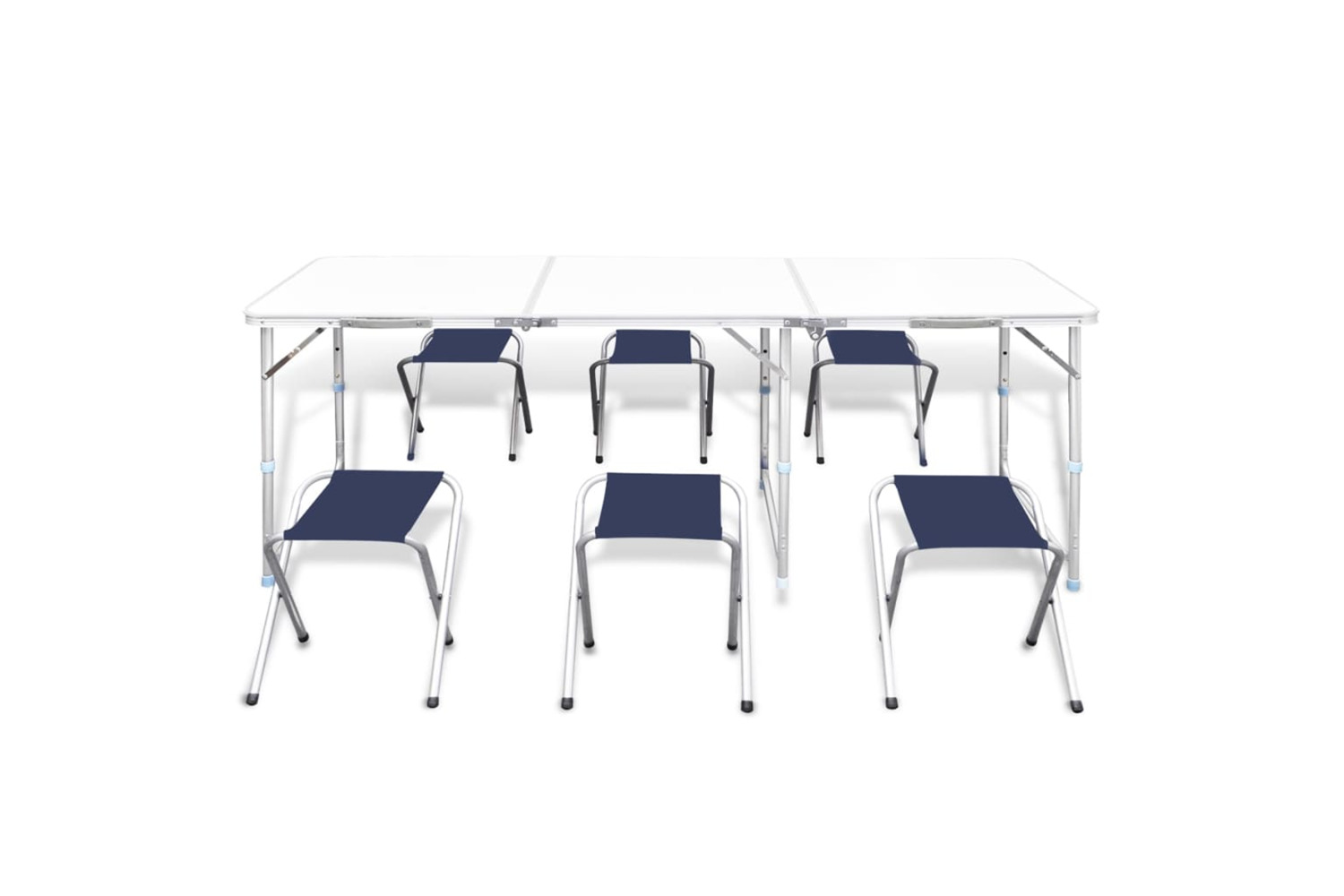 This foldable camping table set consists of 1 foldable table and 6 foldable stools. Thanks to the practical carrying handle and the adjustable height of the table, this set is perfect for uses in kitchens, on patios, in gardens, or on picnics and camping trips.