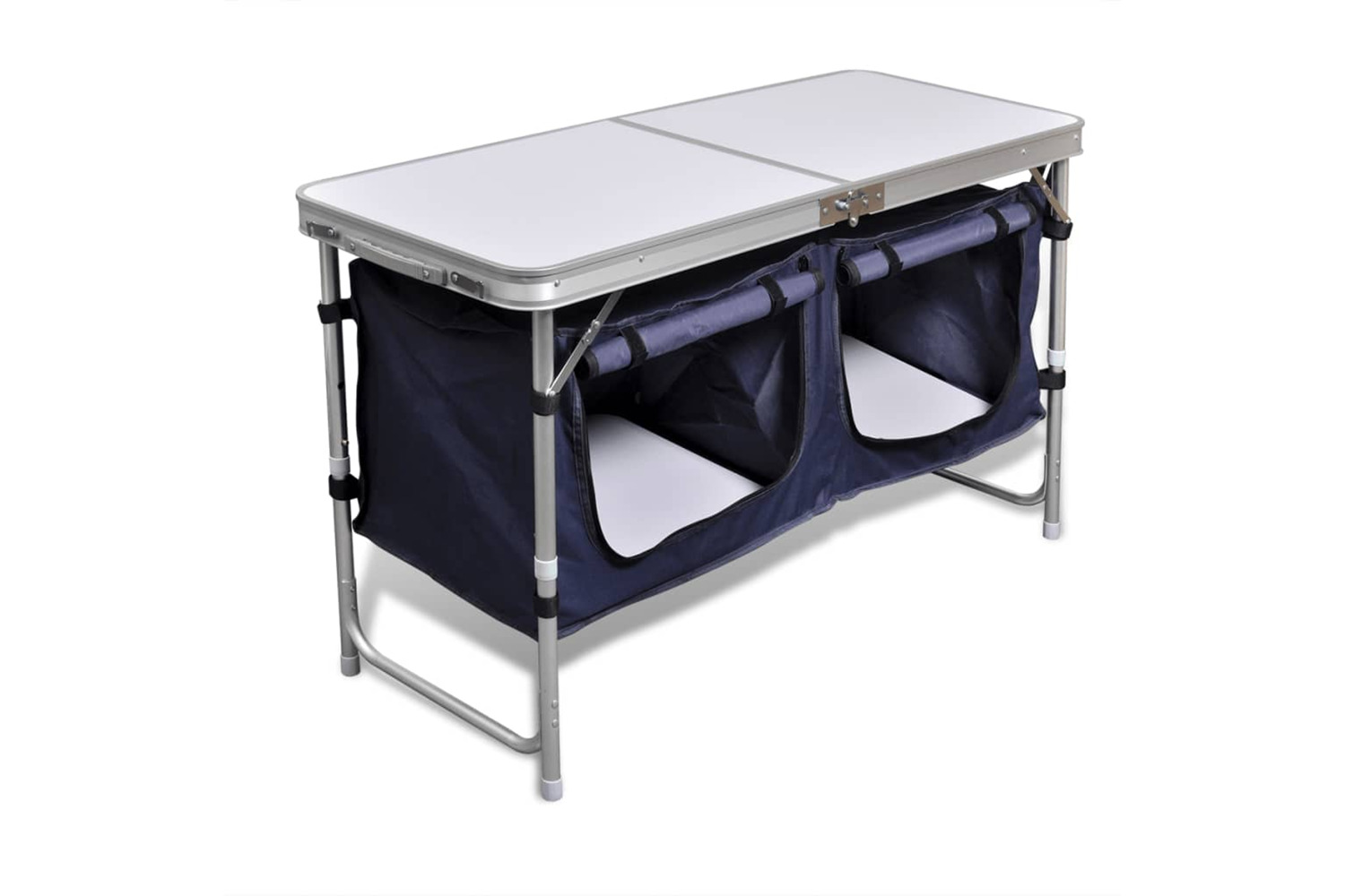 This foldable camping cupboard features a wide work surface and 2 storage compartments. It is perfect for outdoor use.