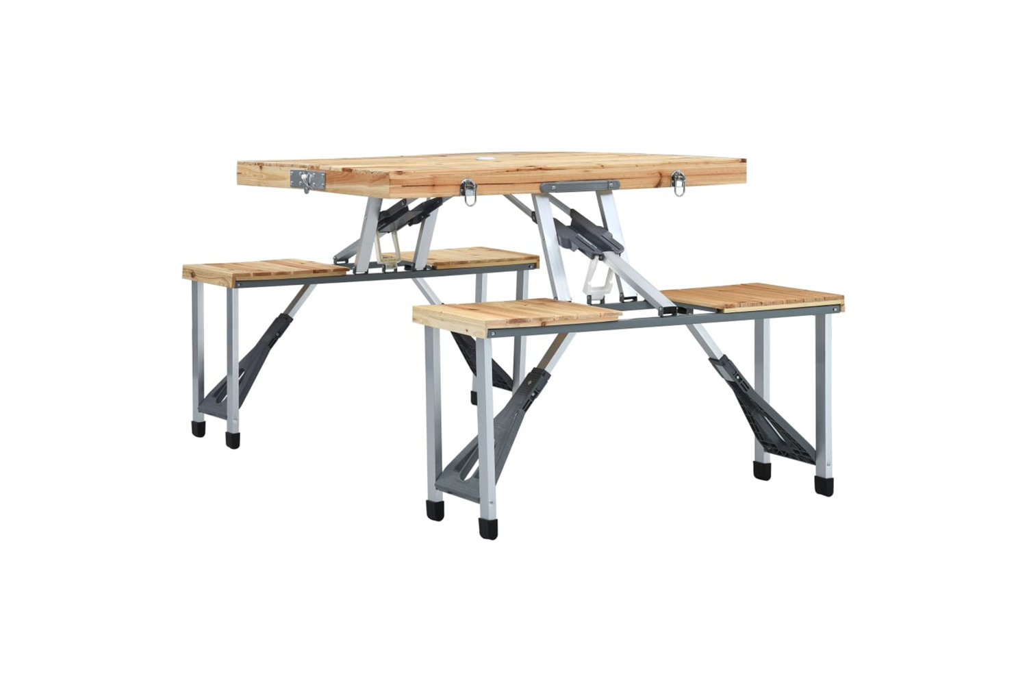 The fir wood surface adds to its natural charm; while premium steel and aluminium frame ensures its durability and sturdiness. Thanks to the folding design, this camping table and seats can be folded into a case, which makes it easy to transport and can be stored away quickly when not in use. Additionally, the parasol hole on the tabletop enables you to install a parasol conveniently.