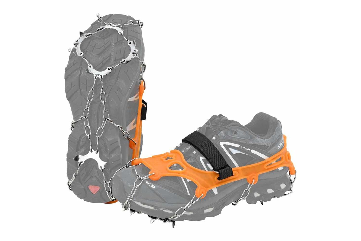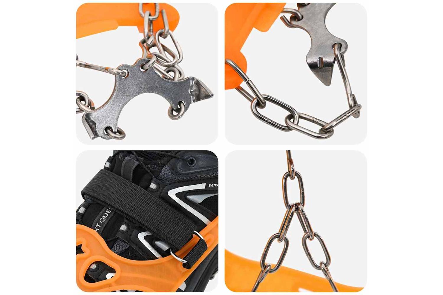 These practical ice cleats for shoes are designed to enhance traction during outdoor winter activities. Their form ensures reliable performance on icy surfaces, making them ideal for hiking on trails with compact snow or even quick urban commutes. Compact in design, these cleats come with an ergonomic structure that adapts seamlessly to most outdoor footwear for a secure fit. Whether you're ascending frosty hills or taking a winter mountain stroll, they ensure stability with ease. The cleats not only offer functionality but also exude a robust and sleek demeanor for the outdoor adventurer, dynamic trail runner, and the everyday walker. Thoughtfully constructed from thermoplastic elastomer combined with stainless steel components, these cleats are suited for extreme temperatures while providing a steady grip on slippery paths.