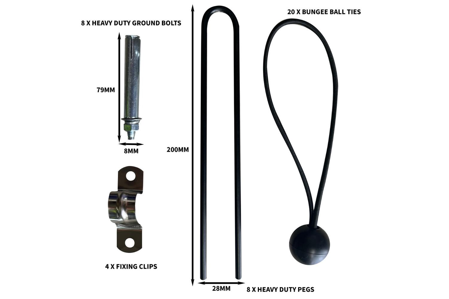 Equipped with an effective anchorage system, this portable bike storage tent excels in performance. The system is assembled with eight extra-long 79mm x 8mm ground bolts specifically built for hard ground. Catering to various surface types, we've supplemented the package with eight heavy-duty grounds pegs allowing you to establish your cover on soft ground, optimising convenience, safety, and peace of mind.