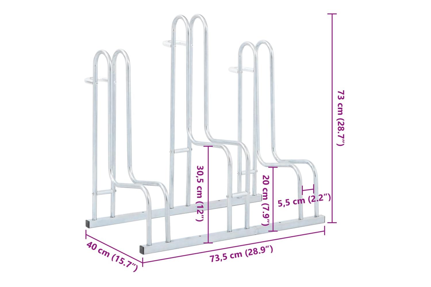 - Space-saving: This bicycle stand has a high-low wheel design and accommodates three bikes without handlebar tangling, optimising space for efficient parking.