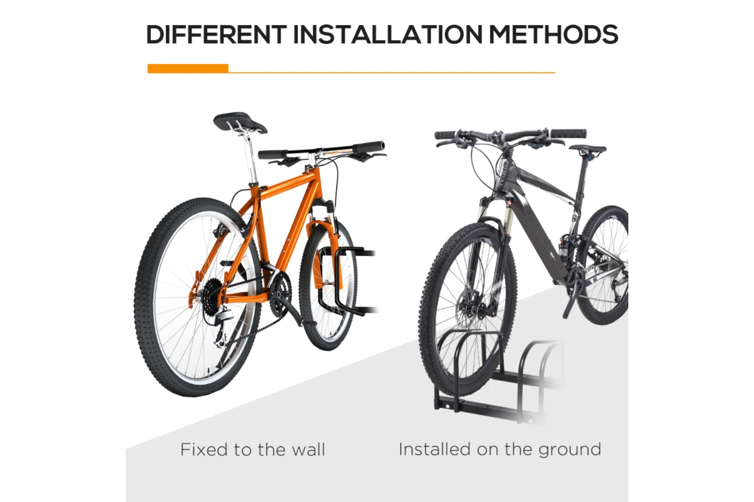 This Bike Parking Rack from HOMCOM is ideal for storing bikes securely in sheds, garages and garden to protect them from scratches or damages, as well as making the parking well-ordered. Made from heavy duty steel with rust-proof powder coating for sturdy construction to enable your long term use. You can park several bikes at the same time or just transform it into a single bike parking rack as you needed. It's very easy to install and disassemble, fits the vast majority of bike tyres and it can be floor or wall mounted. Keep your bikes in order while saving space with this bike parking stand.