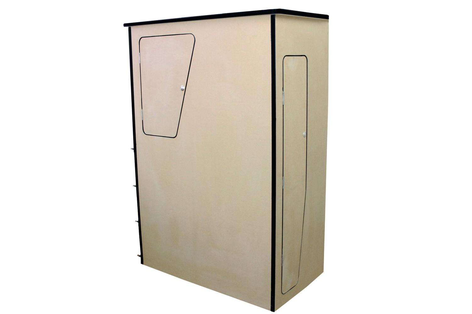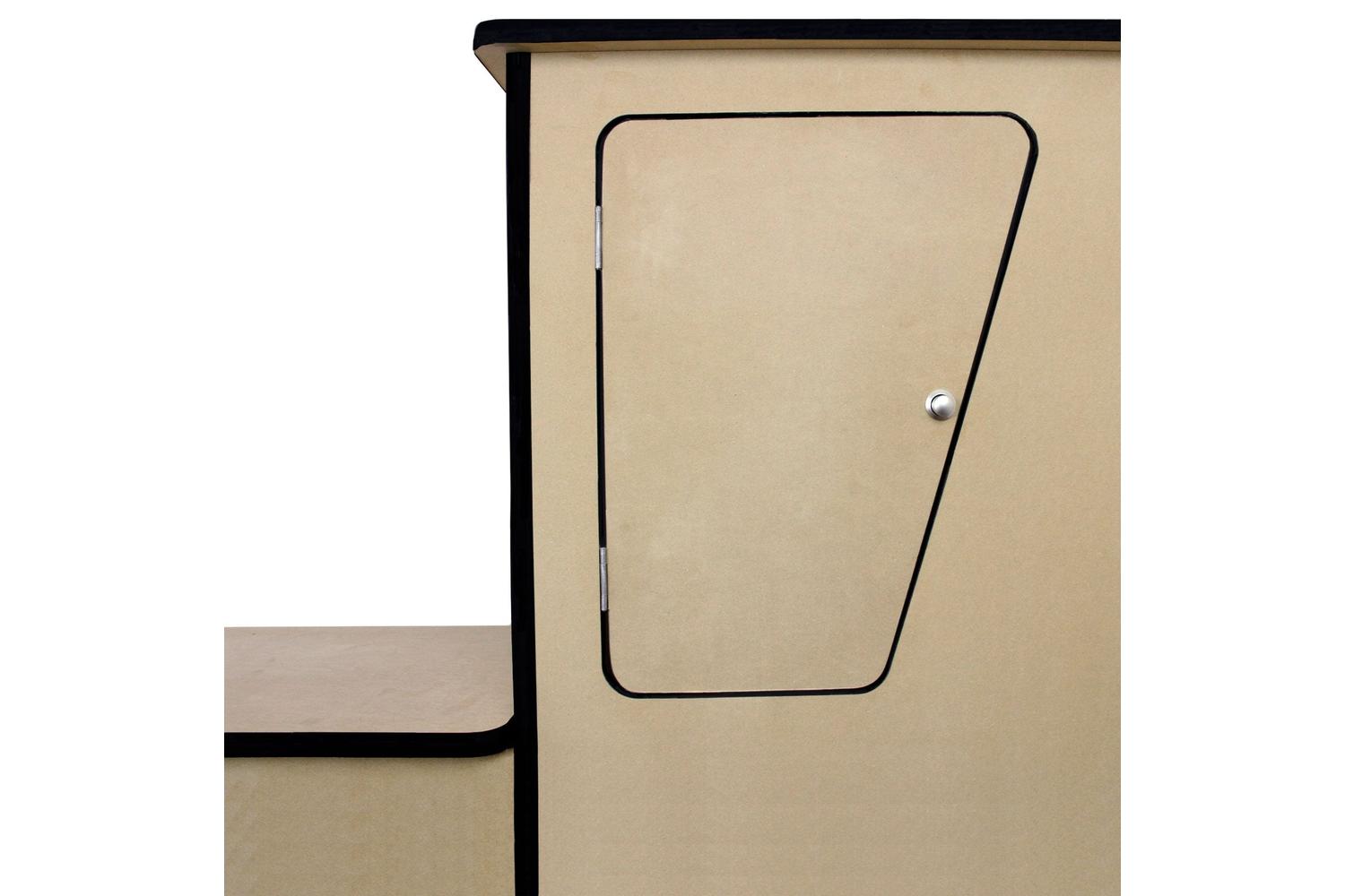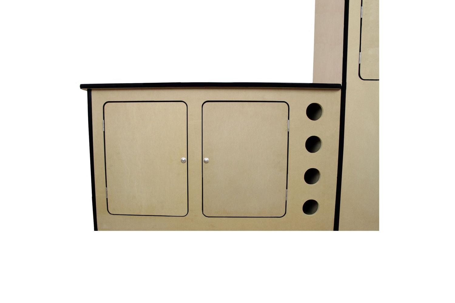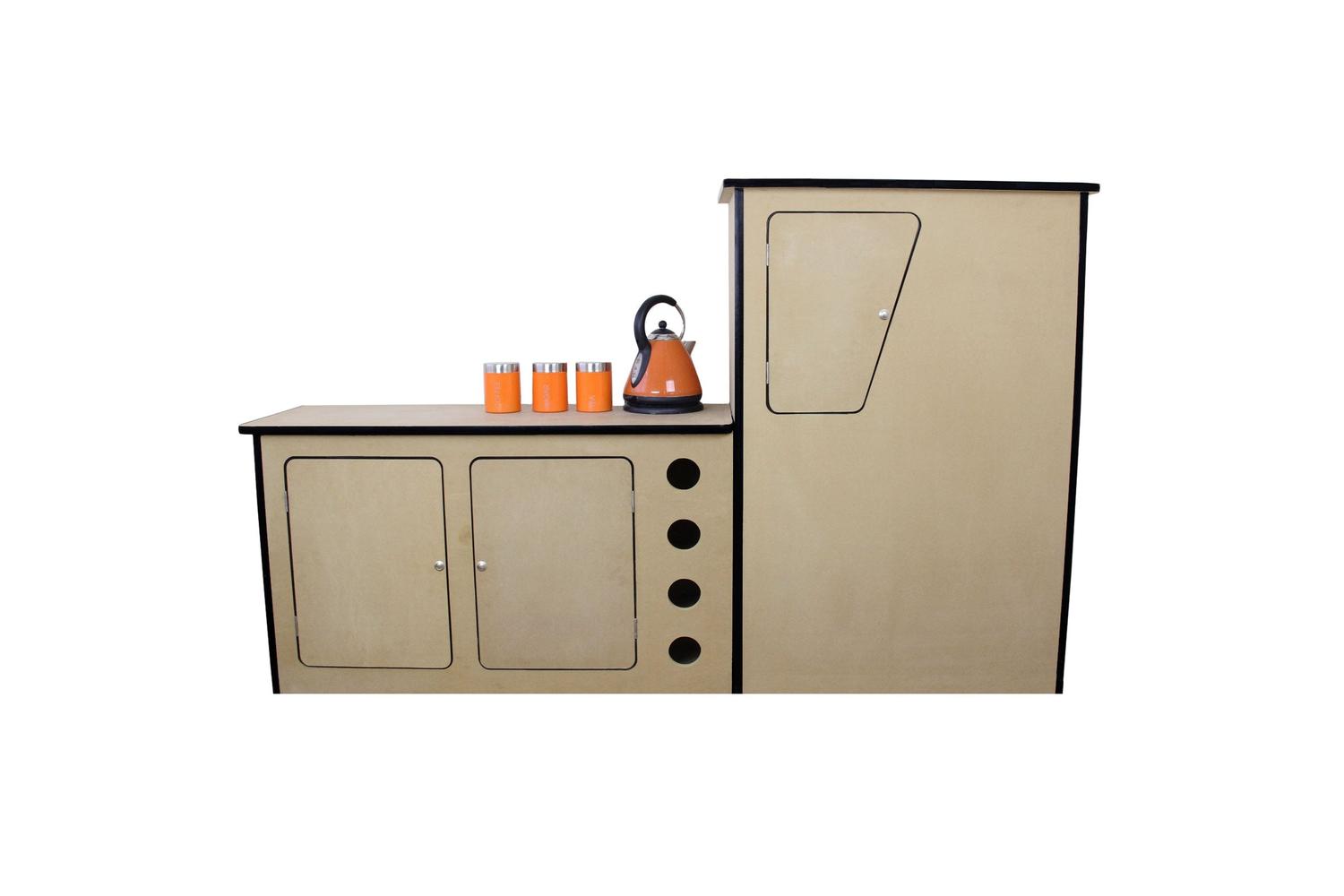 Additionally, the set features a sturdy MDF camper kitchen, perfect for enhancing your motor-home or caravan's functionality. The unfinished surface means you are free to make it uniquely yours by painting, sanding, or even wrapping it. Featuring a built-in wine rack for securing your favourite bottles, and three spacious cupboards fitted with push button handles, all ready to offer you additional storage. Boasting easy assembly and an adjustable flow, this package is the ultimate travel and camping accessory.