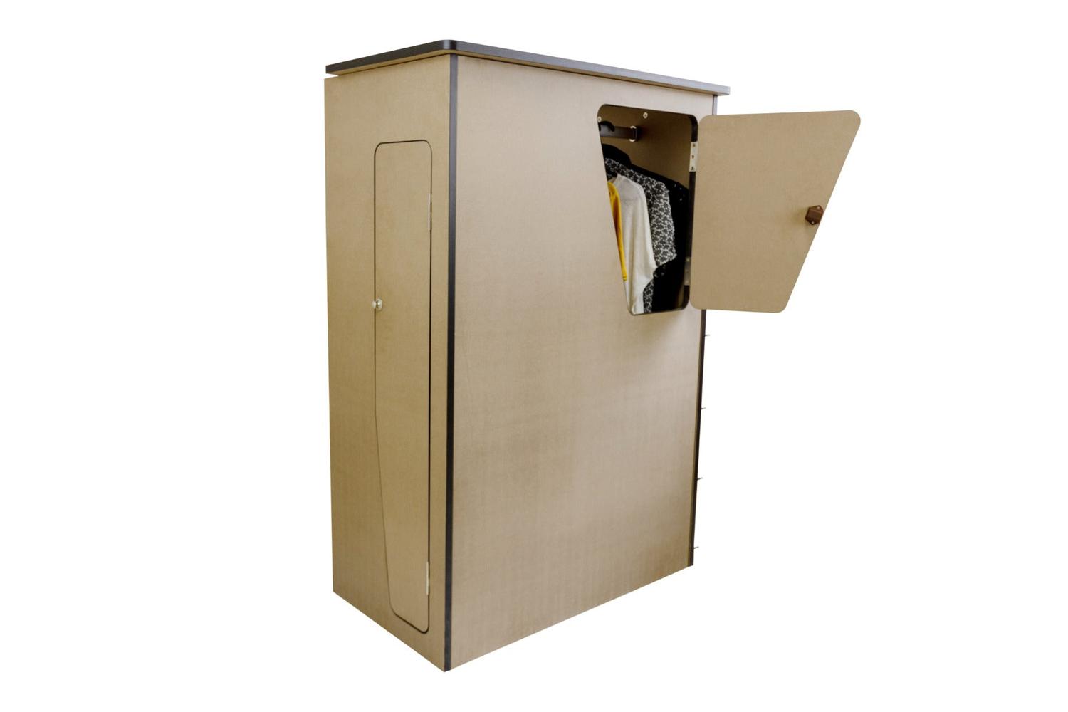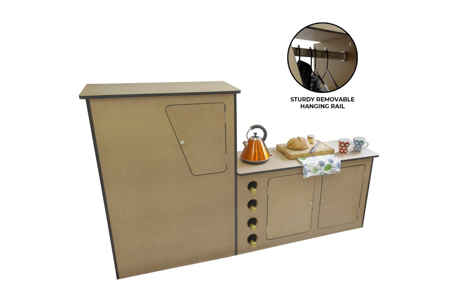 Despite its compact size, this left-hand drive camper kitchen takes full advantage of its space. Housing three spacious cupboards, each fitted with push-button handles, it effortlessly caters to your necessary storage needs. The additional wardrobe compartment accompanied by an optional hanging rail furthers the unit's function.