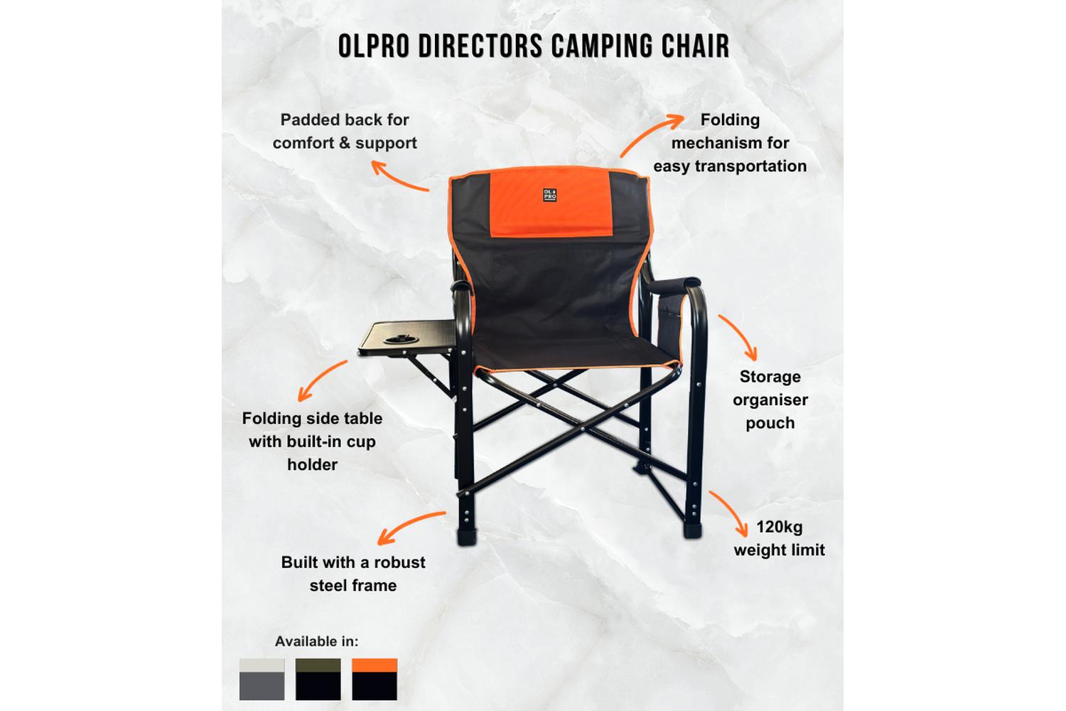 Time to add style, comfort, and functionality to your outdoor adventure arsenal; your perfect partner awaits you. Get your hands on the OLPRO Directors Chair today and embark upon your adventurous journey cordially bathed in utter comfort and unparalleled practicality.