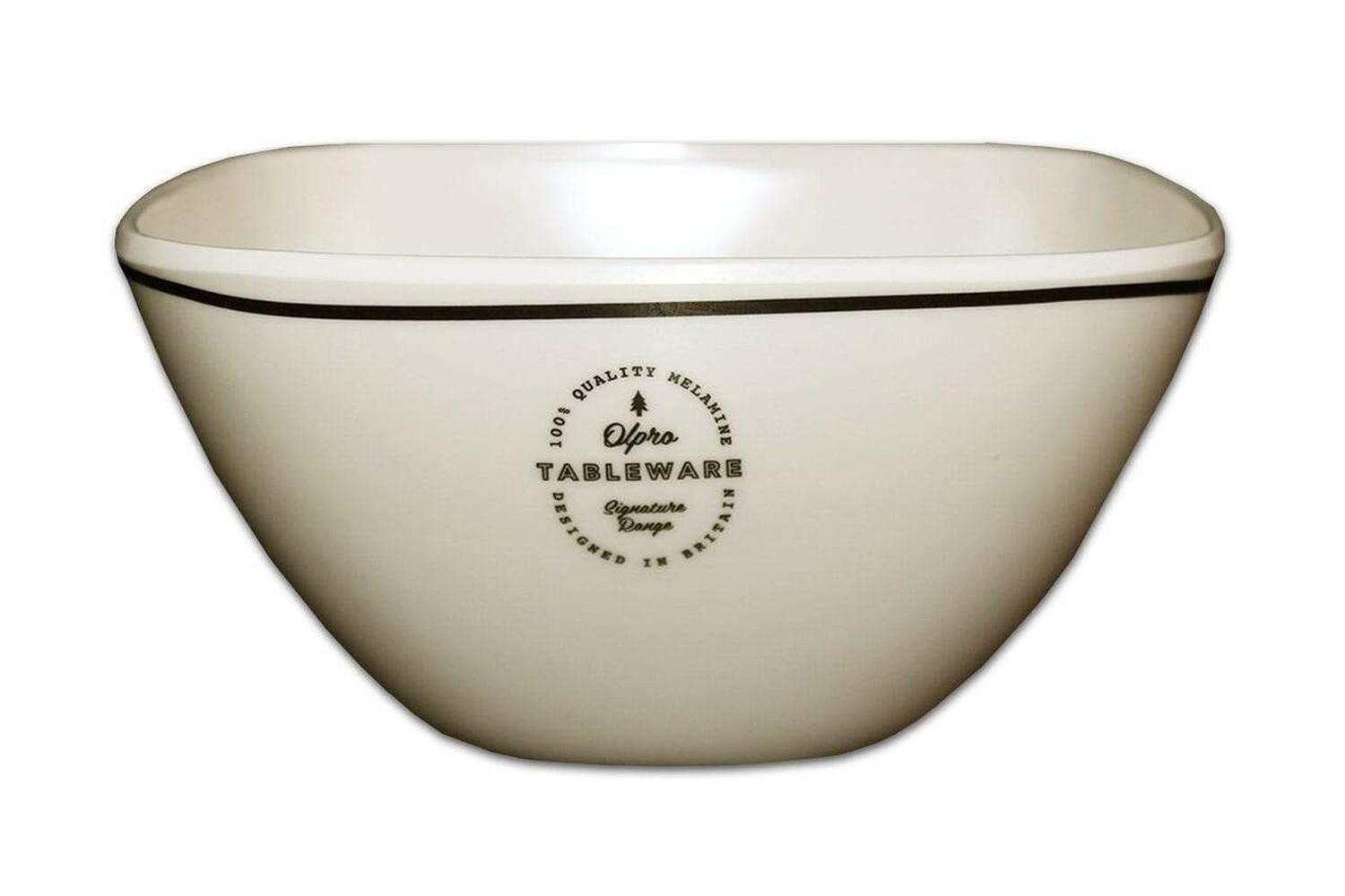 - Square plates and bowls with a wide-topped OLPRO mug.