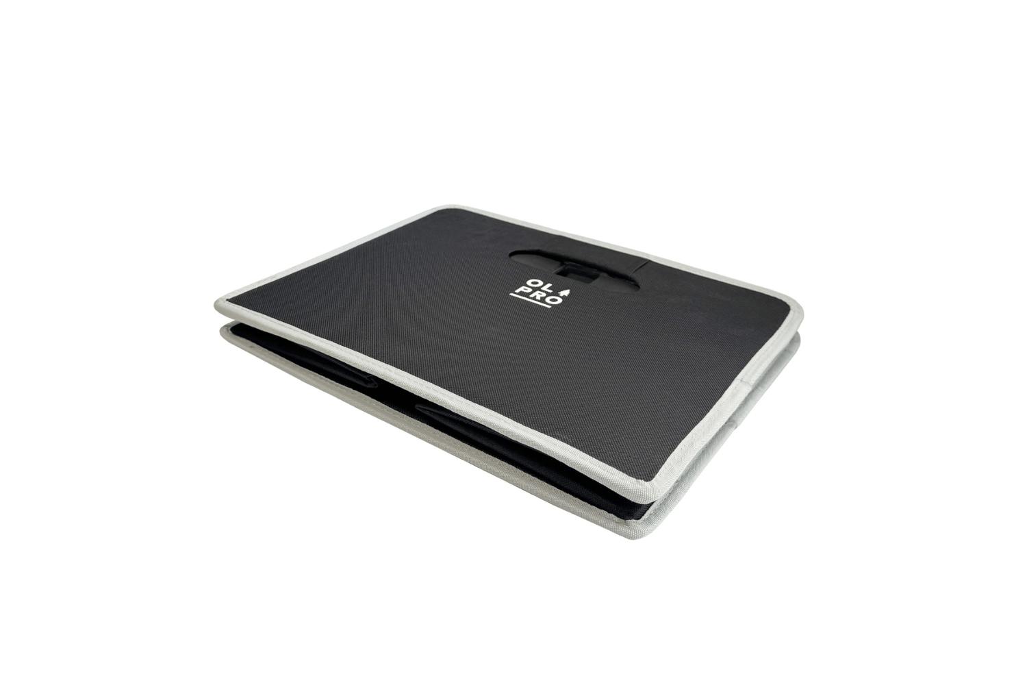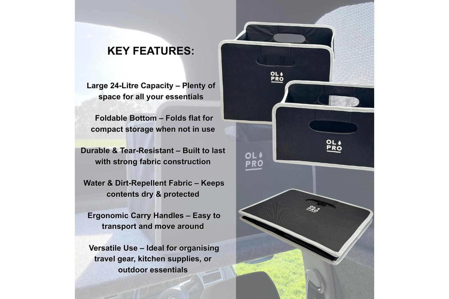 Crafted in black and accented on the sides by sleek grey bindings, the 24L OLPRO folding storage box champions the balance of function and form. Replete with features promoting comfort and utility, the product illuminates a shift in the one-dimensional camping narrative and turns it into a model of 'Active' living filled with memories and convenience.