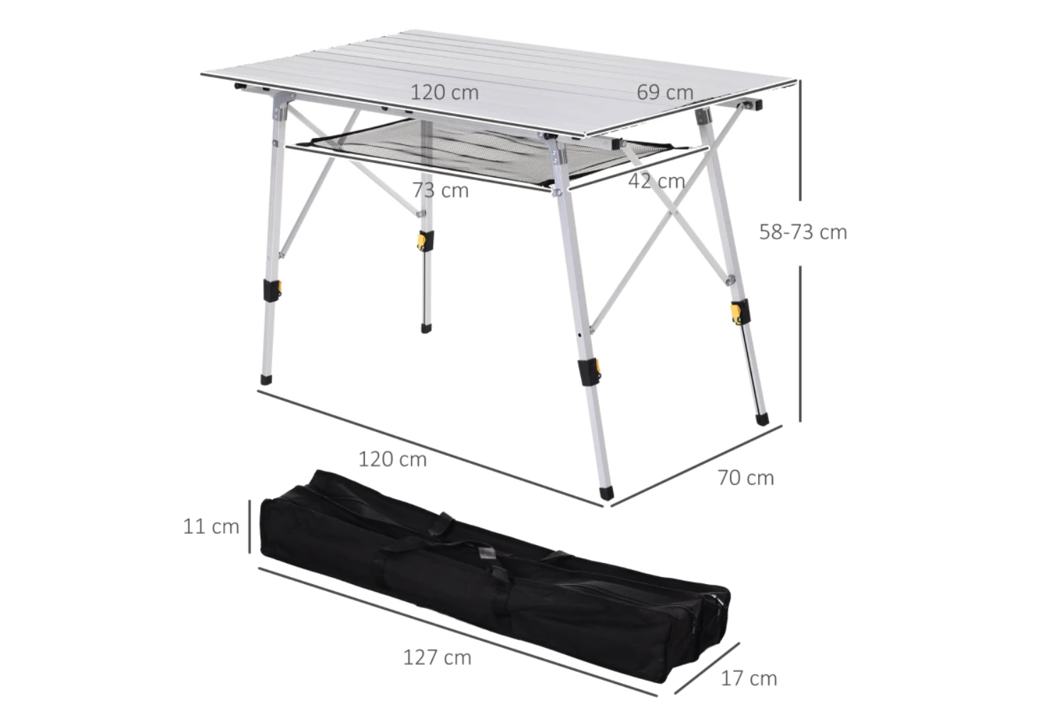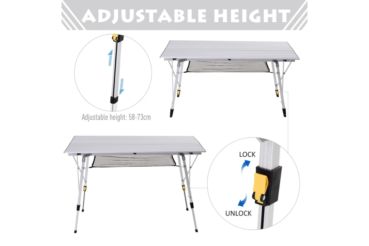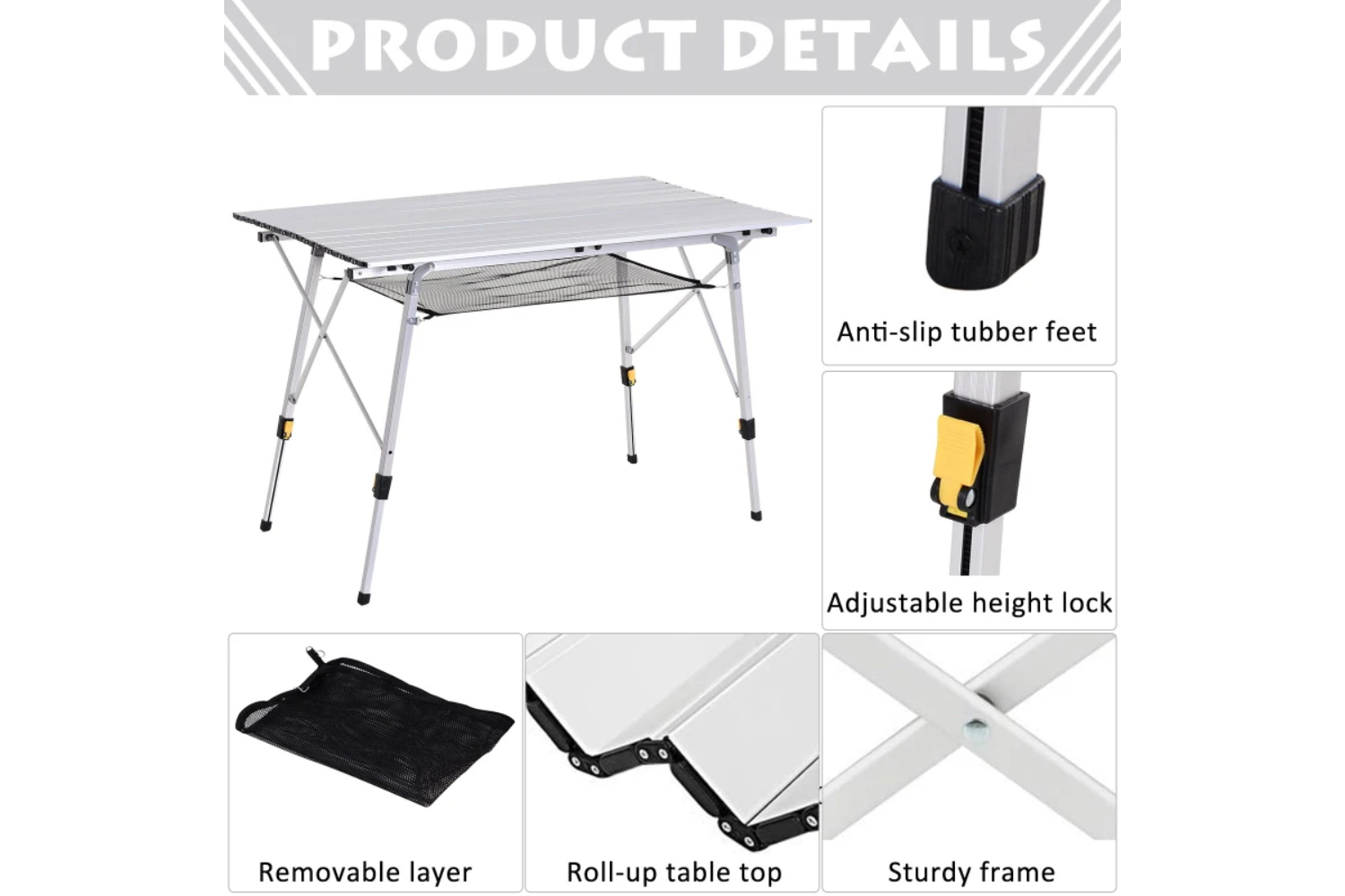 Outdoor livings can be easy with this Outsunny Picnic Table. Large roll-up table surface for storaging fruits, snacks, dishes or small accessories. The folding table is made of aluminum and resists spills and weather and sturdy easy to clean. Its 2-level height setting and lightweight design makes it perfect for people with various needs.Mesh bottom layer provide more space and hold more stuffs Ideal for families who enjoy camping, rv trips or tailgating and great for Girl/Boy Scout cookie selling.
