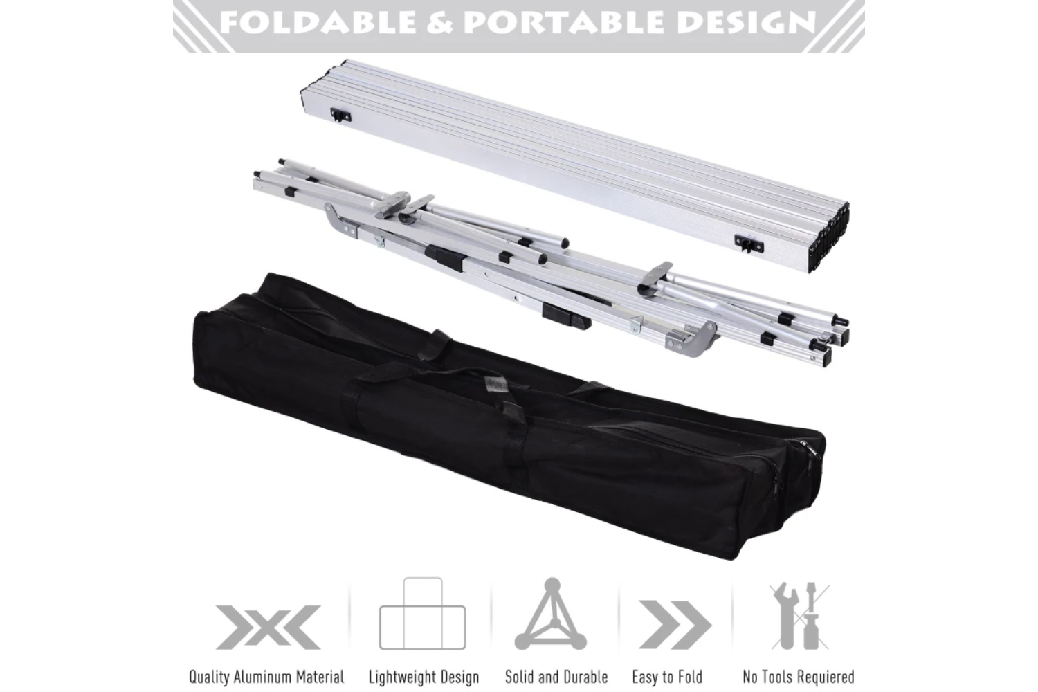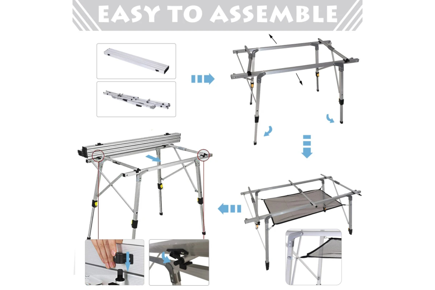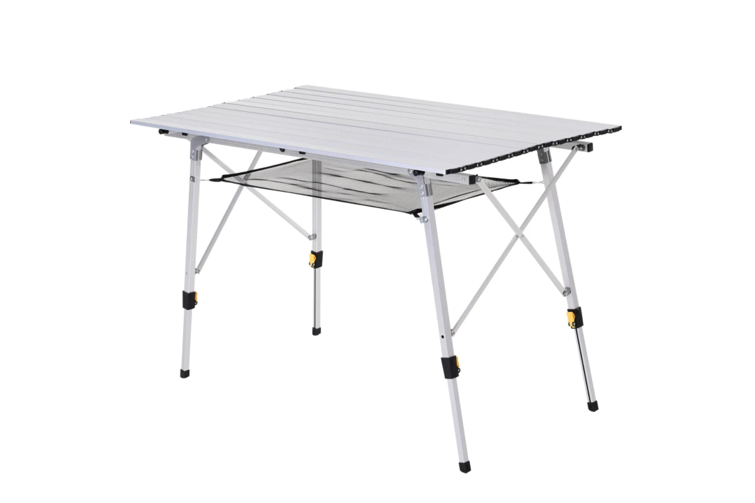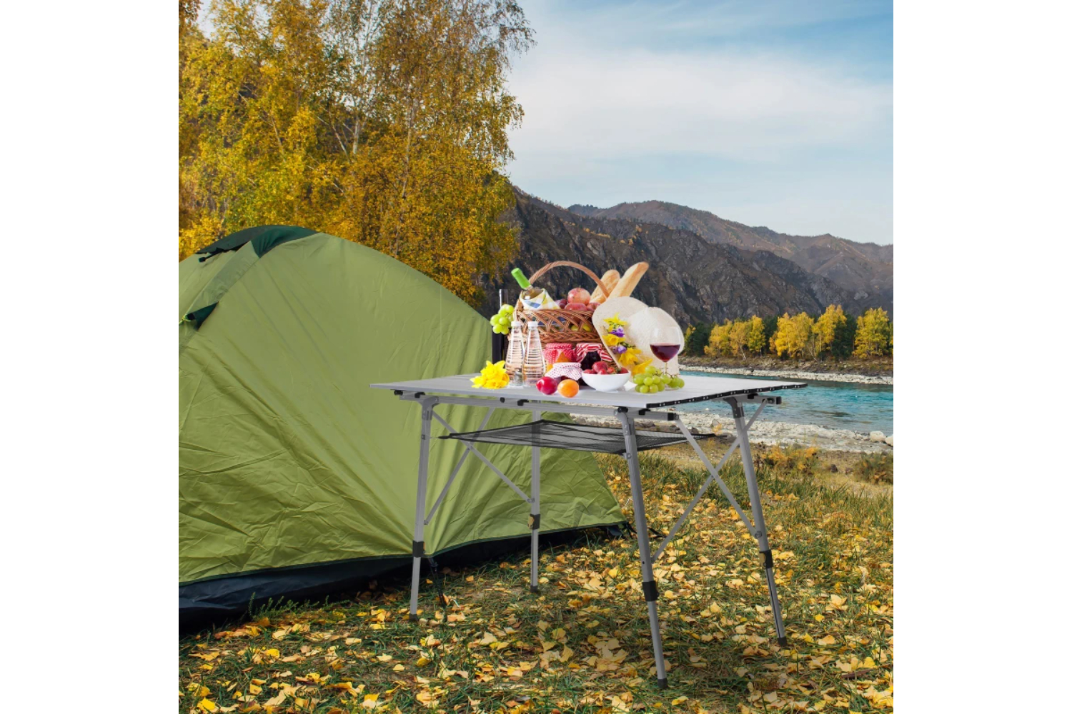 Outdoor livings can be easy with this Outsunny Picnic Table. Large roll-up table surface for storaging fruits, snacks, dishes or small accessories. The folding table is made of aluminum and resists spills and weather and sturdy easy to clean. Its 2-level height setting and lightweight design makes it perfect for people with various needs.Mesh bottom layer provide more space and hold more stuffs Ideal for families who enjoy camping, rv trips or tailgating and great for Girl/Boy Scout cookie selling.