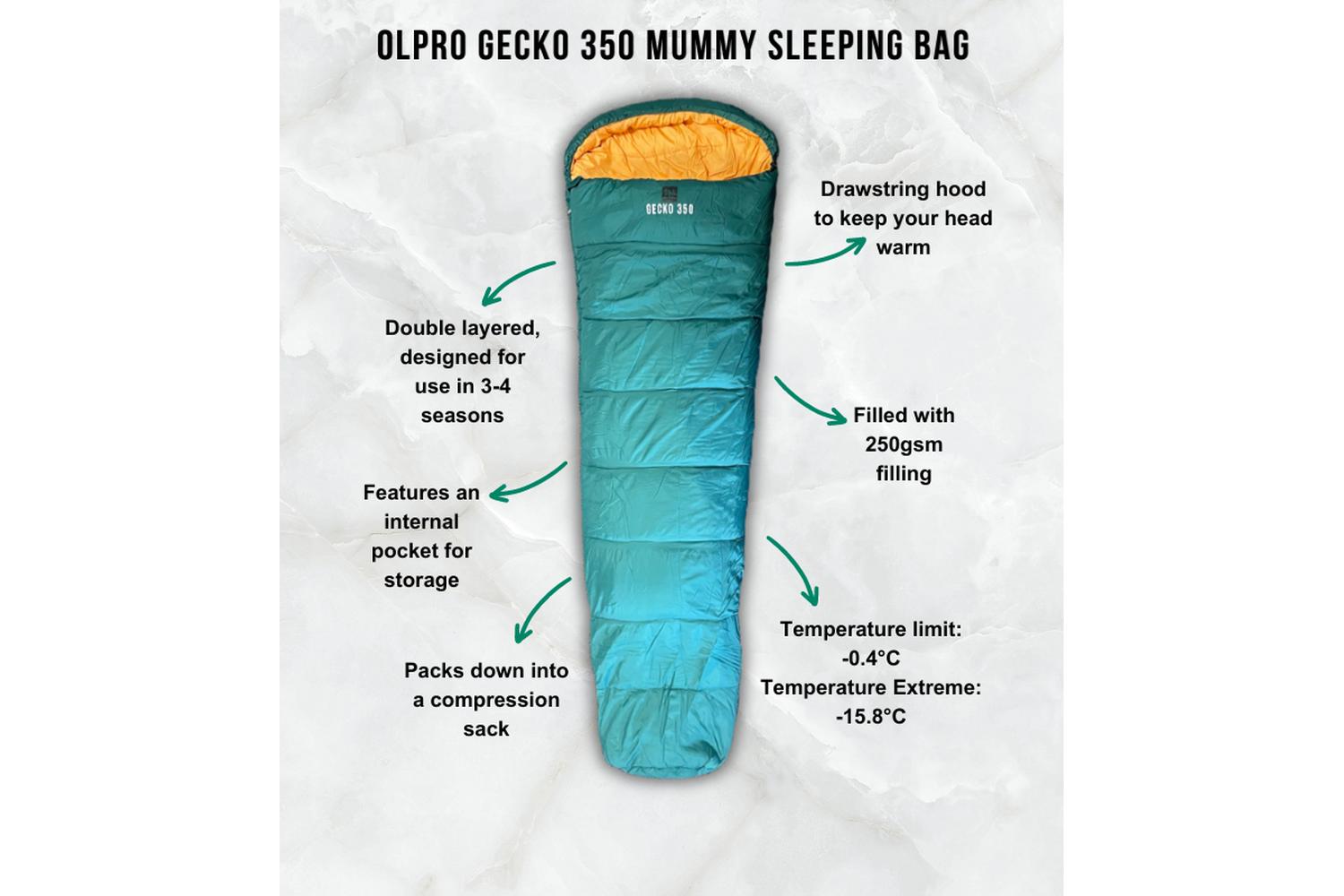 When it's time for that good night's sleep under the stars, opt for the durable, comfortable and warm Gecko 350 Mummy Sleeping Bag from the renowned camping experts at OLPRO.