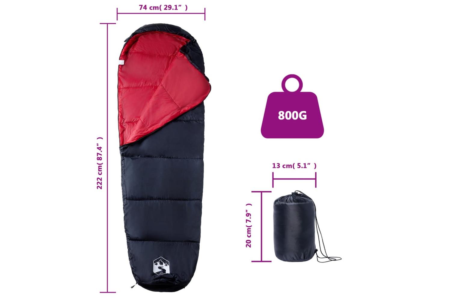 - Sleeping bag size: 222 x 74 cm (L x W)