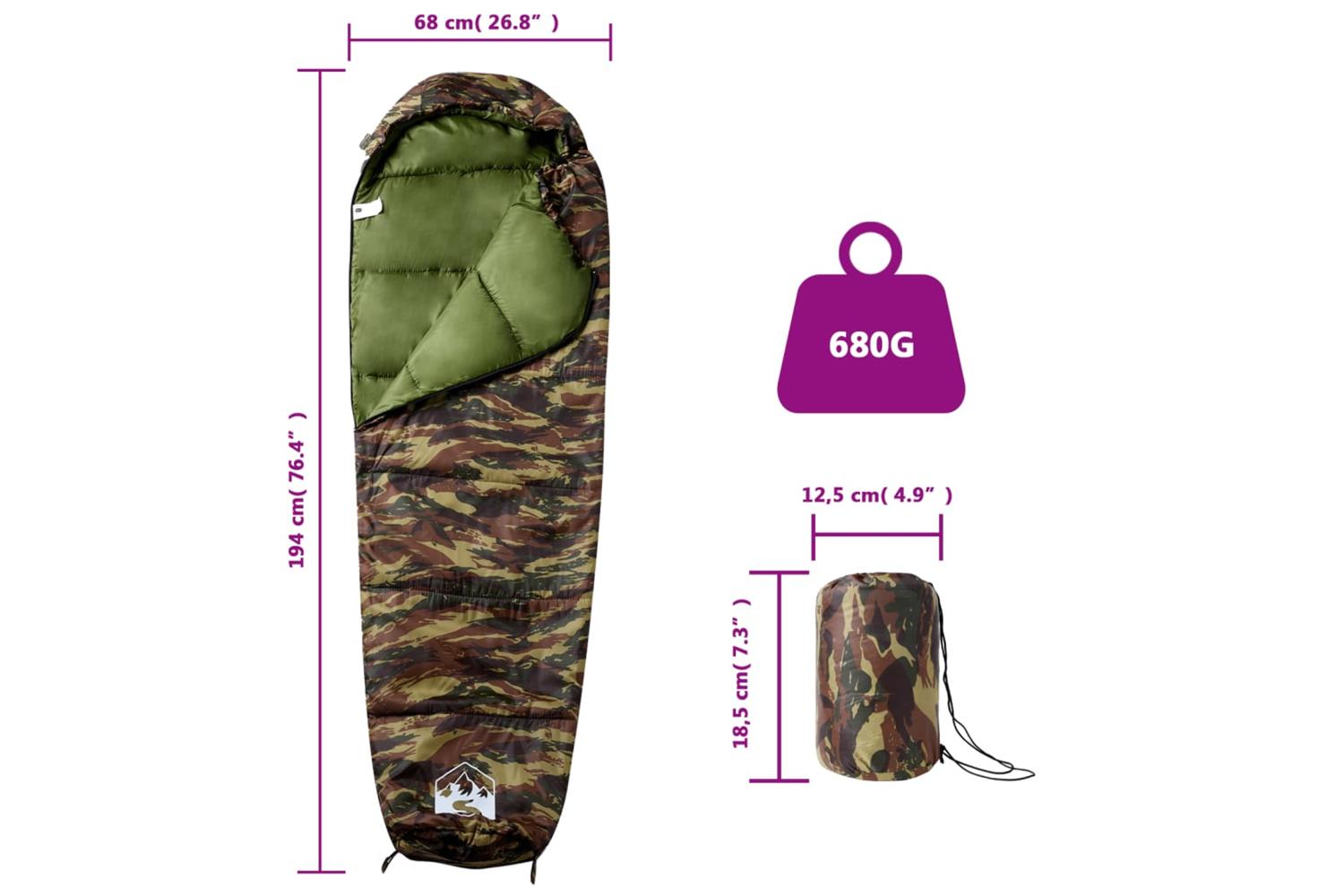 - Sleeping bag size: 194 x 68 cm (L x W)