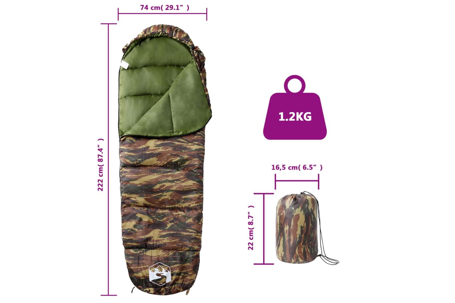 - Sleeping bag size: 222 x 74 cm (L x W)