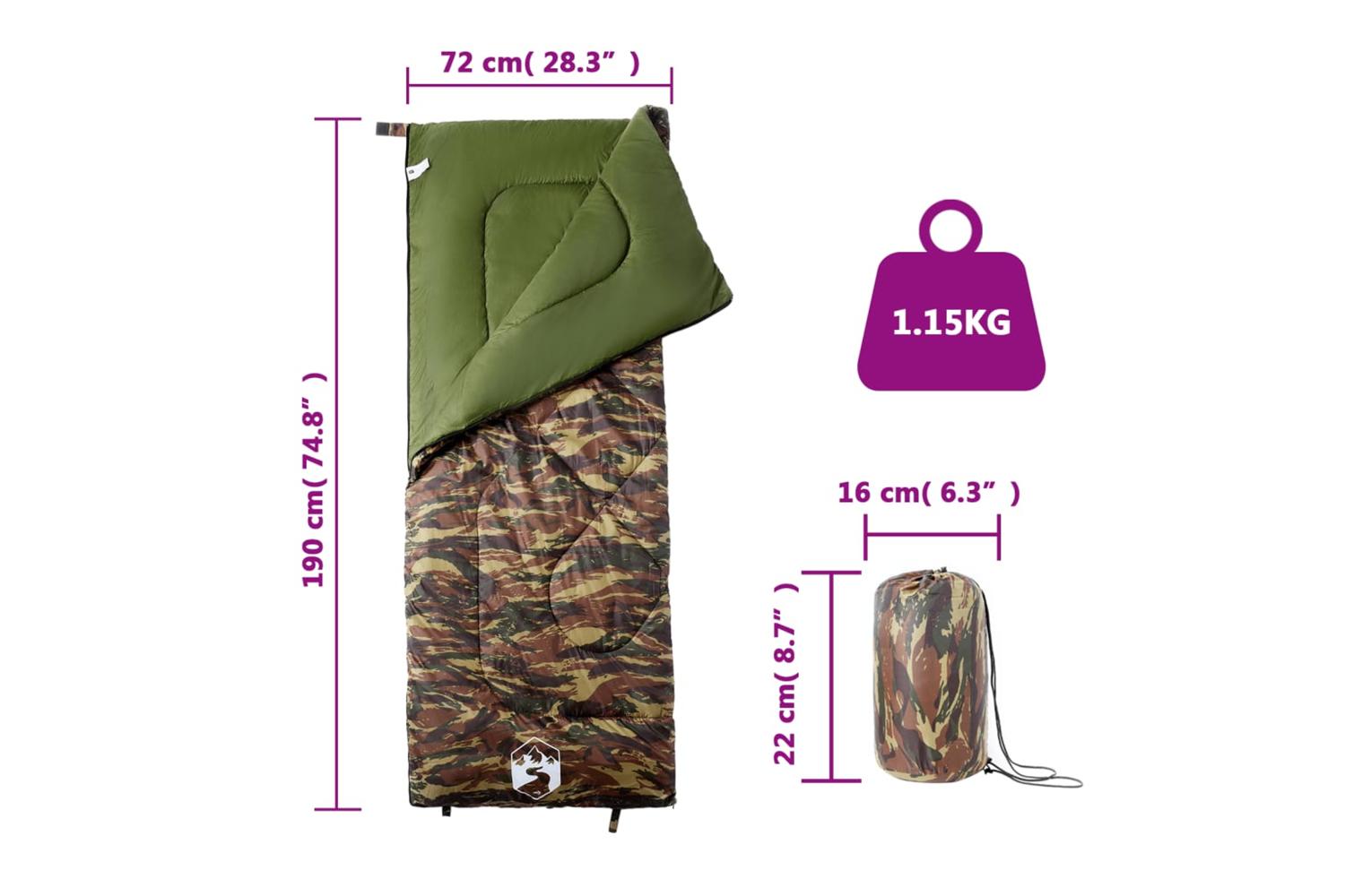 - Sleeping bag size: 190 x 72 cm (L x W)