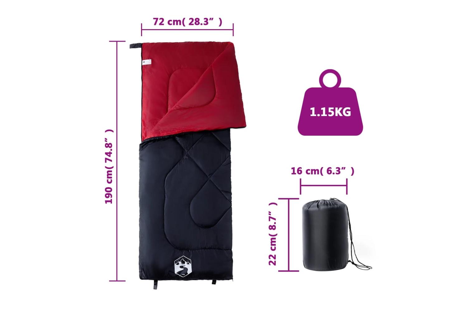 - Sleeping bag size: 190 x 72 cm (L x W)