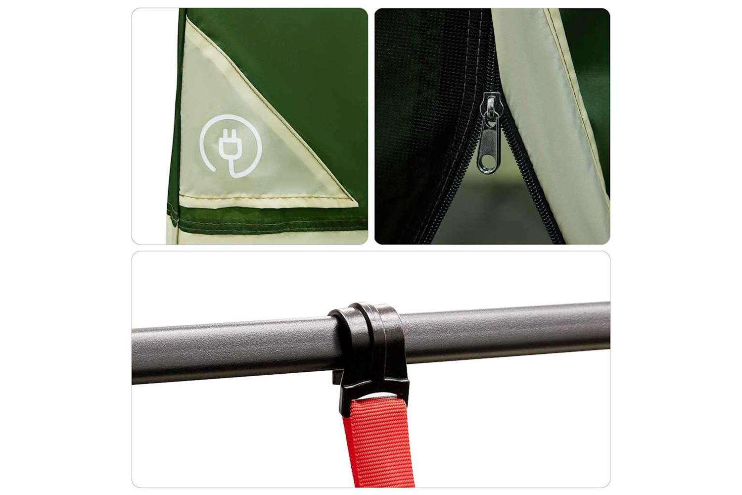 - Functional Features: Featuring a modern design with two zipper doors for seamless access. The innovative E-port design allows electrical access, making modern conveniences accessible even in remote areas. A handy hanging hook inside offers practical storage for lights or gear.