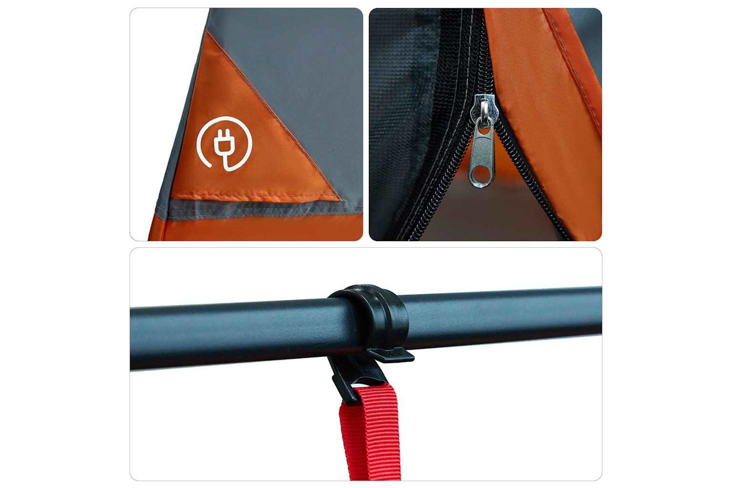 - Functional Features: Featuring a modern design with two zipper doors for seamless access. The innovative E-port design allows electrical access, making modern conveniences accessible even in remote areas. A handy hanging hook inside offers practical storage for lights or gear.