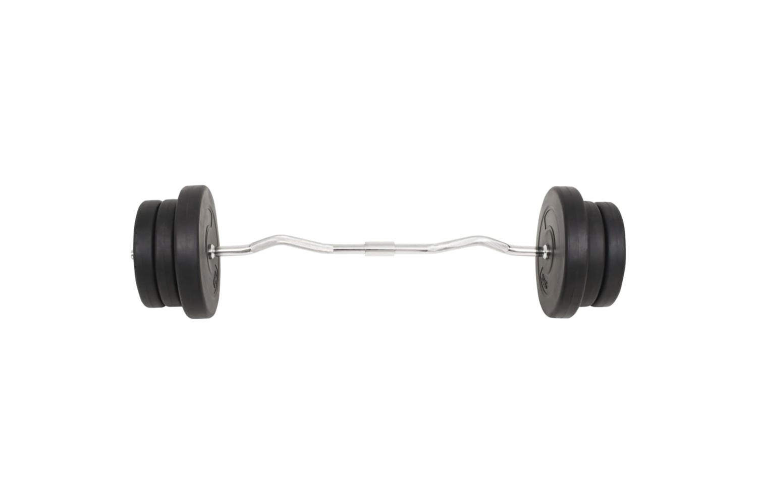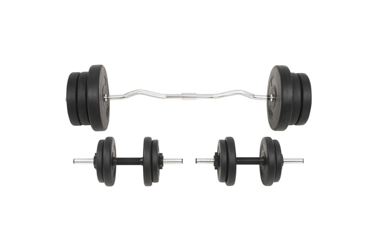 This versatile barbell and dumbbell set is perfect for targeting chest, biceps, arms, triceps and back muscles. It includes four 10 kg weight plates, four 5 kg weight plates, four 2 kg weight plates, four 1.25 kg weight plates, one barbell bar and two dumbbell bar and has a total weight of about 60 kg.