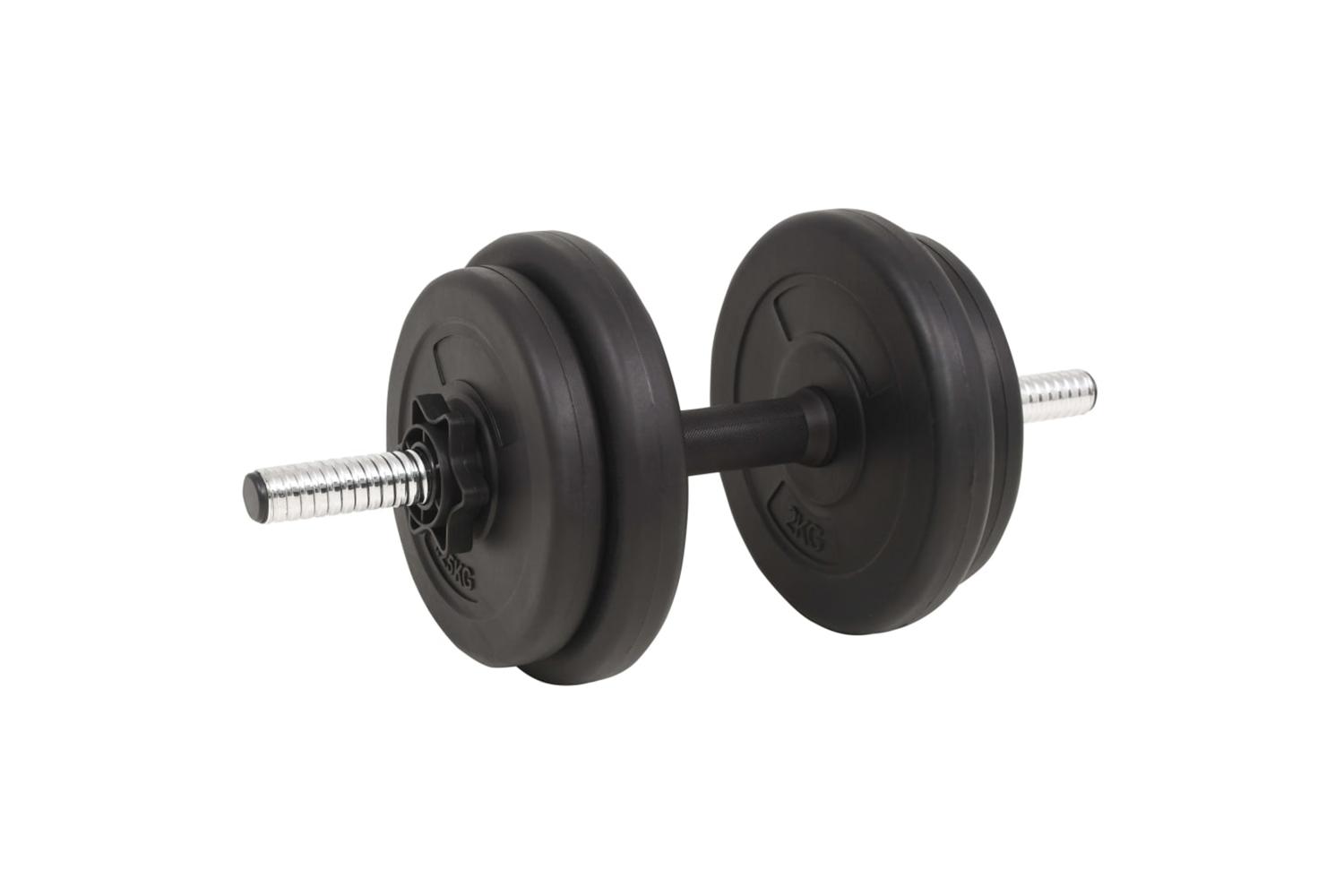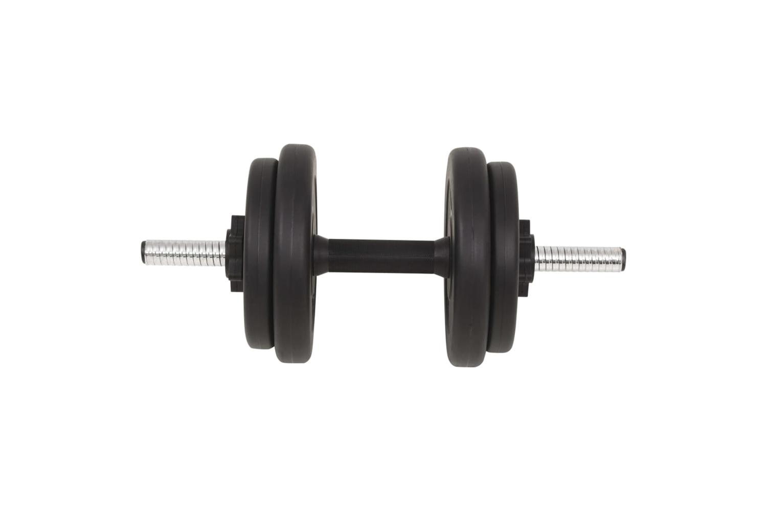 This versatile barbell and dumbbell set is perfect for chest, biceps, arms, triceps and back muscles. It includes two 10 kg plates, four 5 kg plates, four 2 kg plates, four 1.25 kg plates, one barbell bar and two dumbbell bar and has a total weight of about 60 kg.