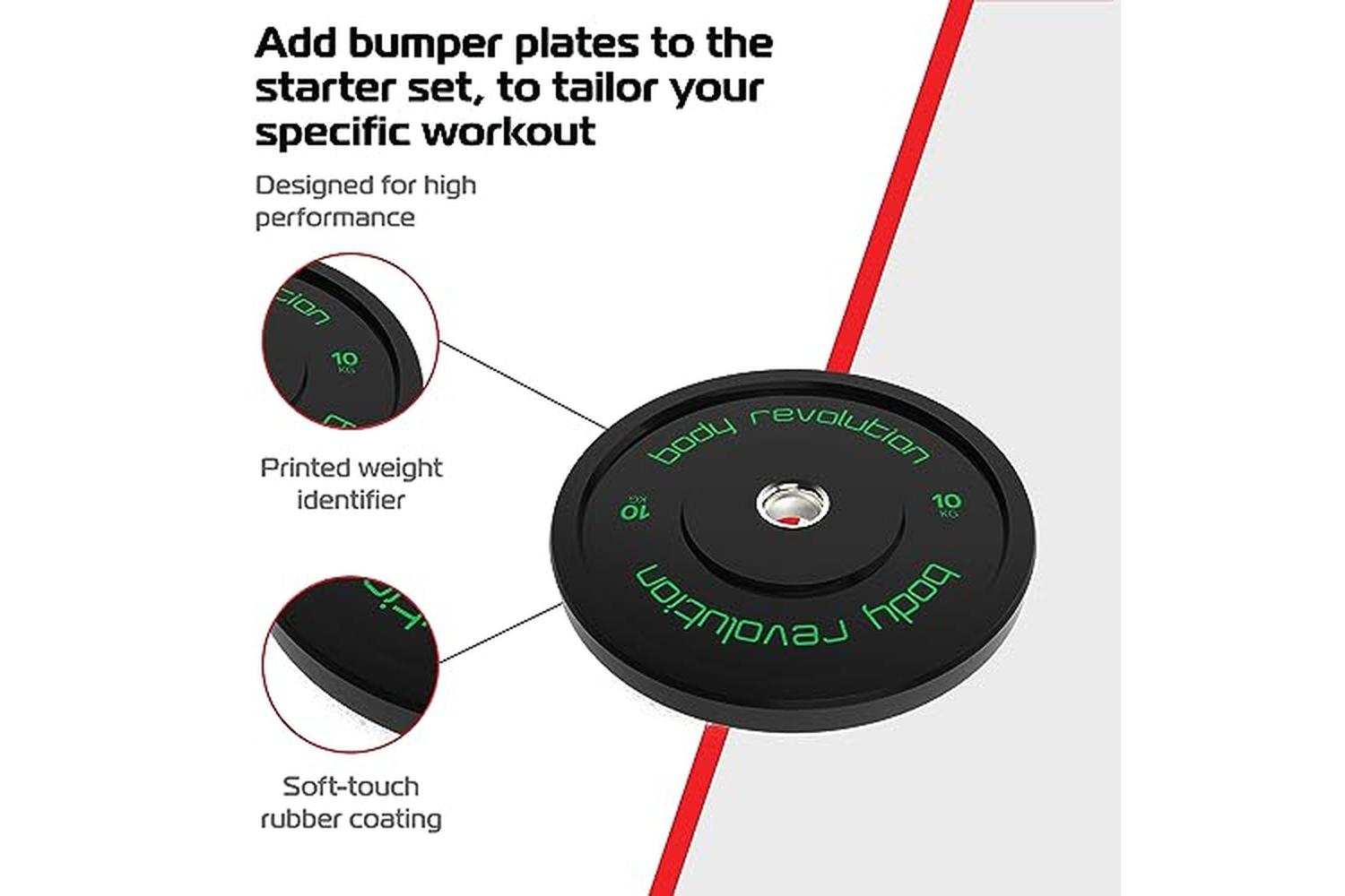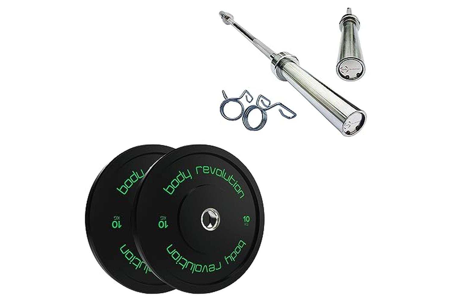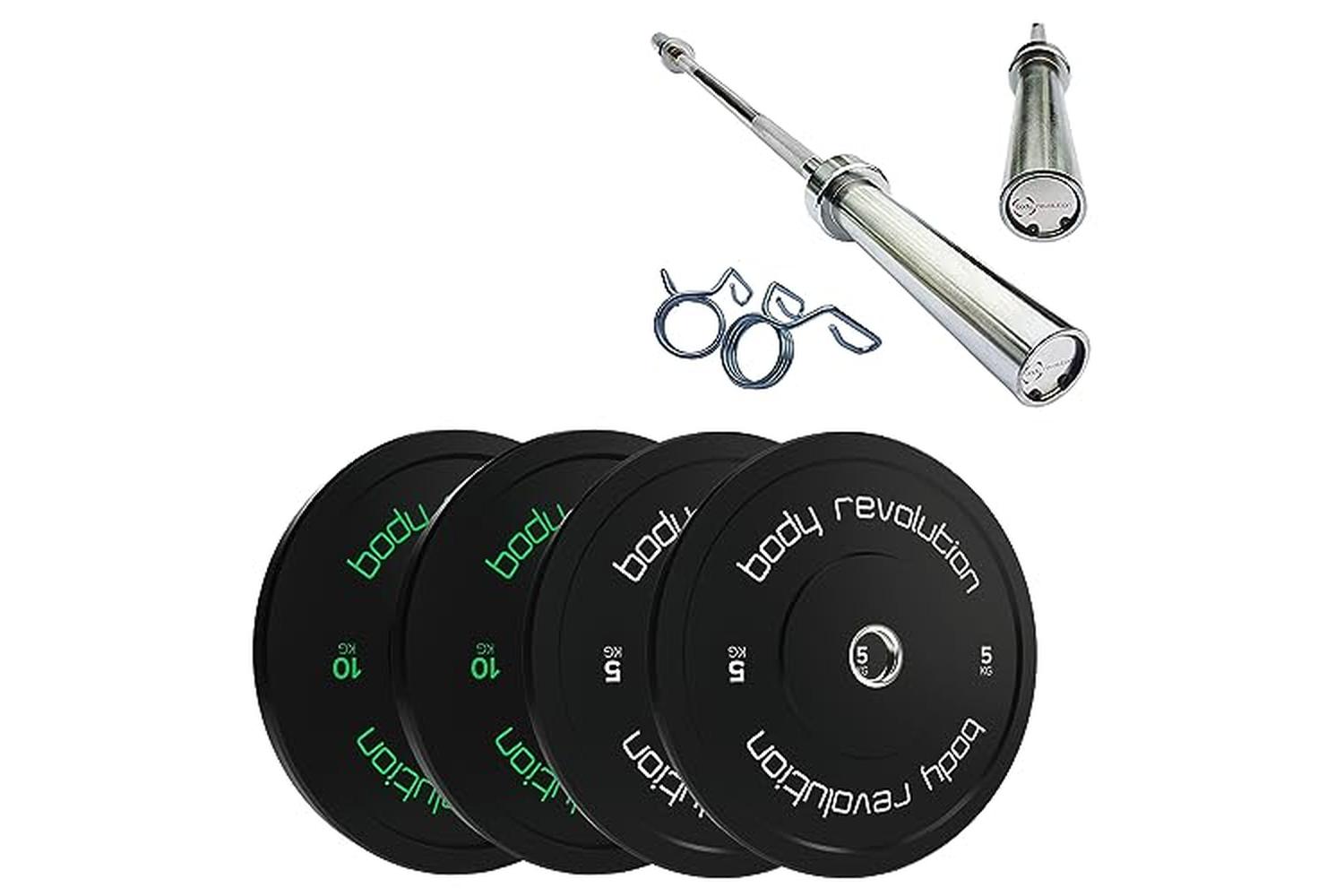 The Olympic barbell bars are compatible with 2 inch weight plates and are designed for maximum weight loading capacity allowing continuous powerlifting progression. The 45cm diameter black rubber bumper plates are compatible with 2 inch barbells and are colour-coded according to size.
