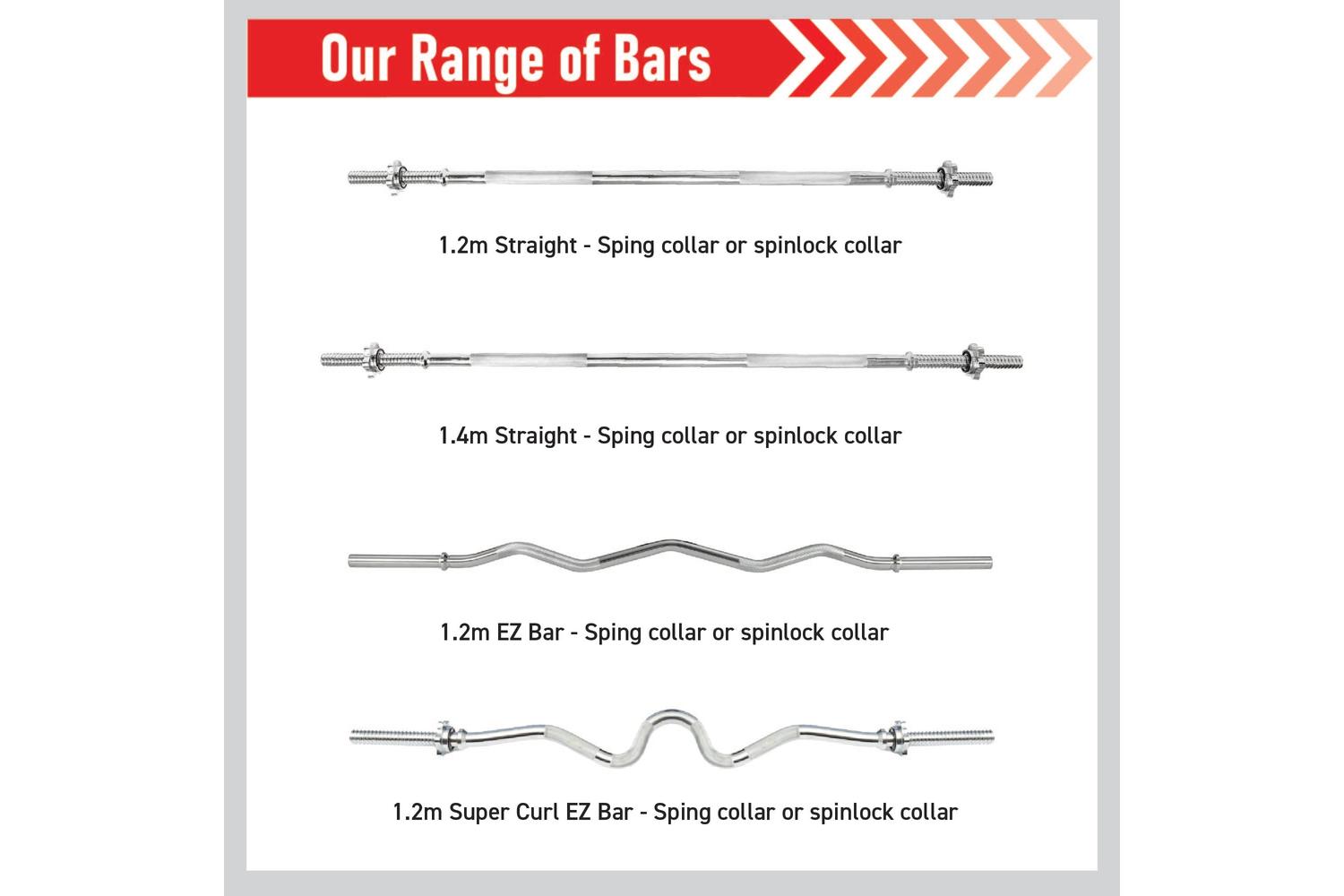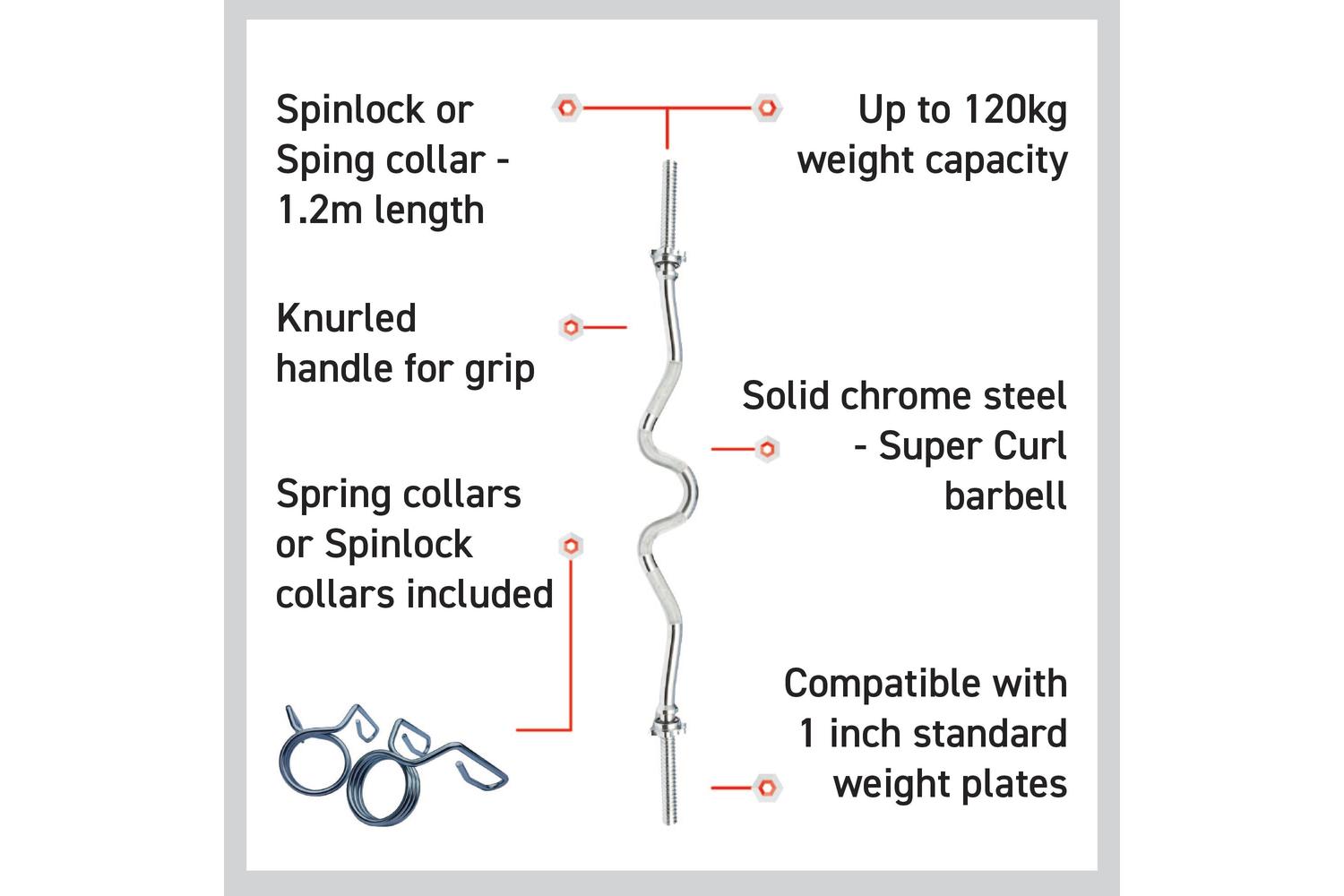 The 1.2m / 4ft EZ Super Curl Bar barbell bars are compatible with 1 inch weight plates and are designed for maximum weight loading capacity allowing continuous powerlifting progression.