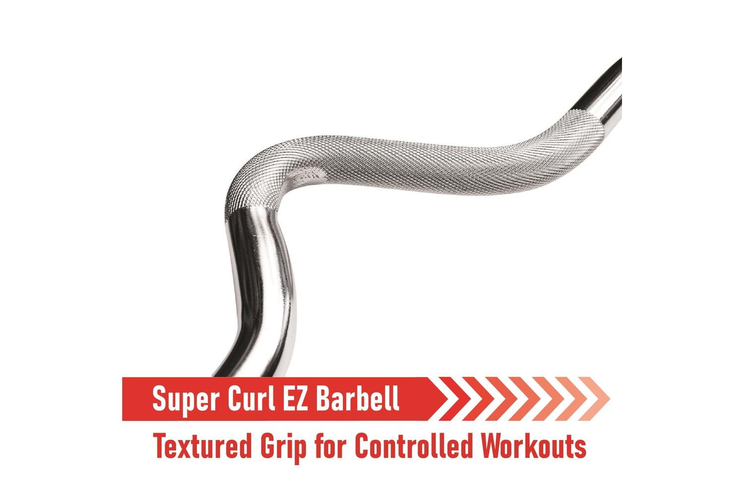 The EZ Super Curl handle features a knurled grip design and is made from chrome steel to provide a greater level of grip and control. Angled bar targets specific muscle groups.