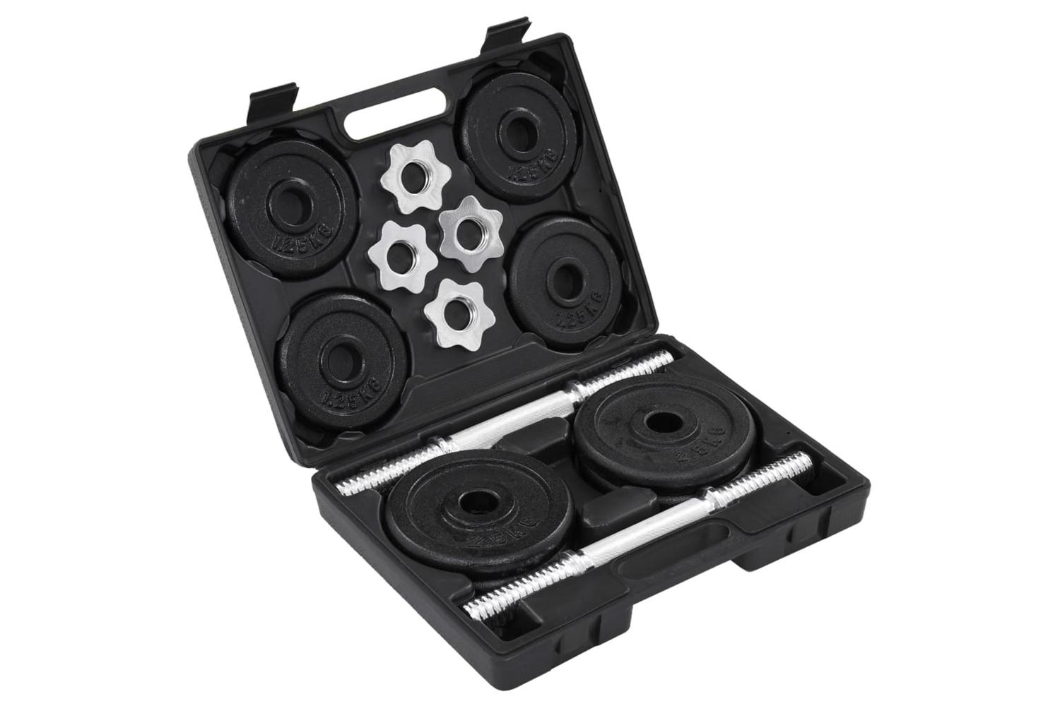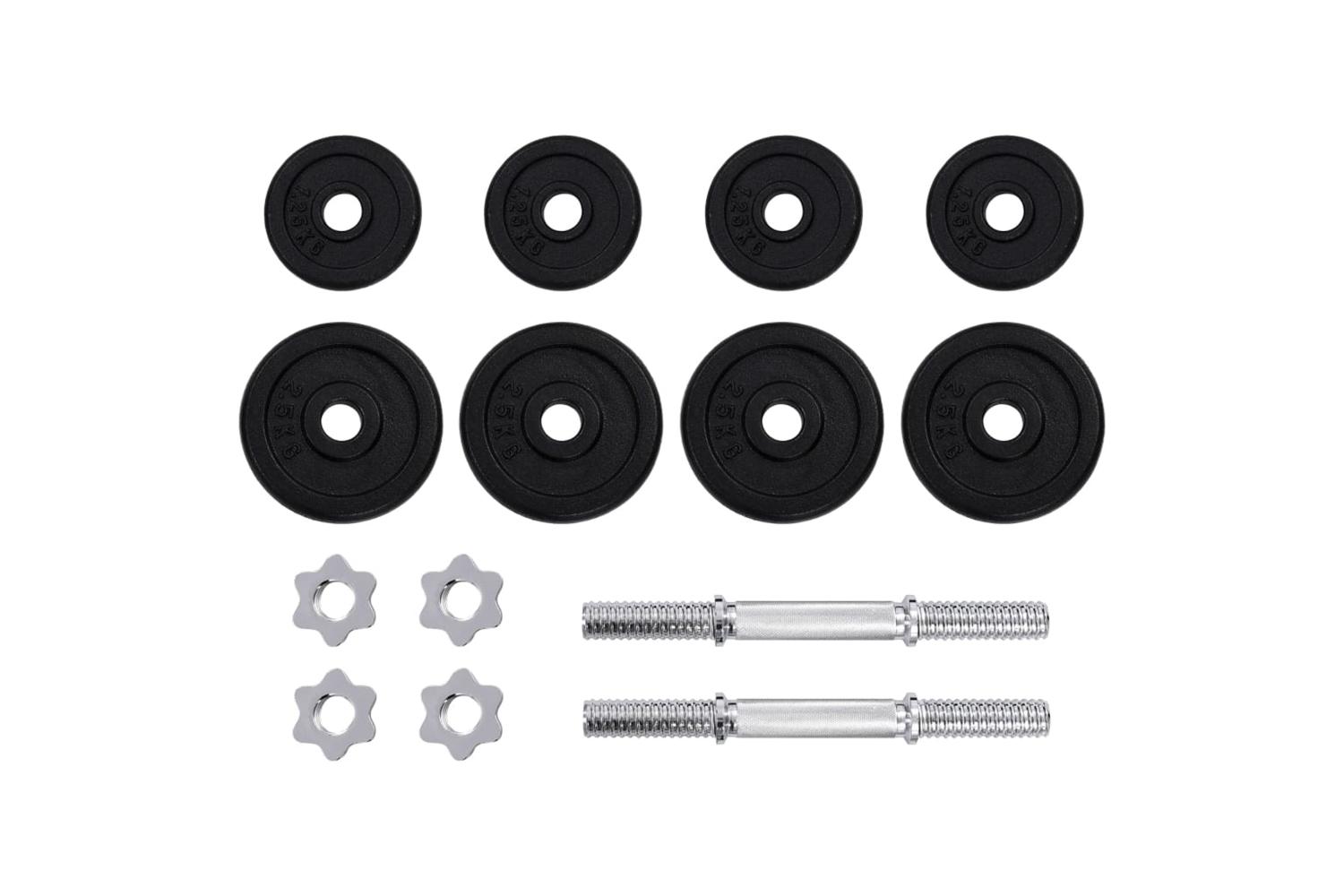 This versatile dumbbell set is perfect for targeting chest, biceps, arms, triceps and back muscles. It includes four 1.25 kg weight plates, four 2.5 kg weight plates, as well as two steel dumbbell bars, which has a total weight of about 20 kg. This set allows the users to variably select the weights they want to lift for different exercises.