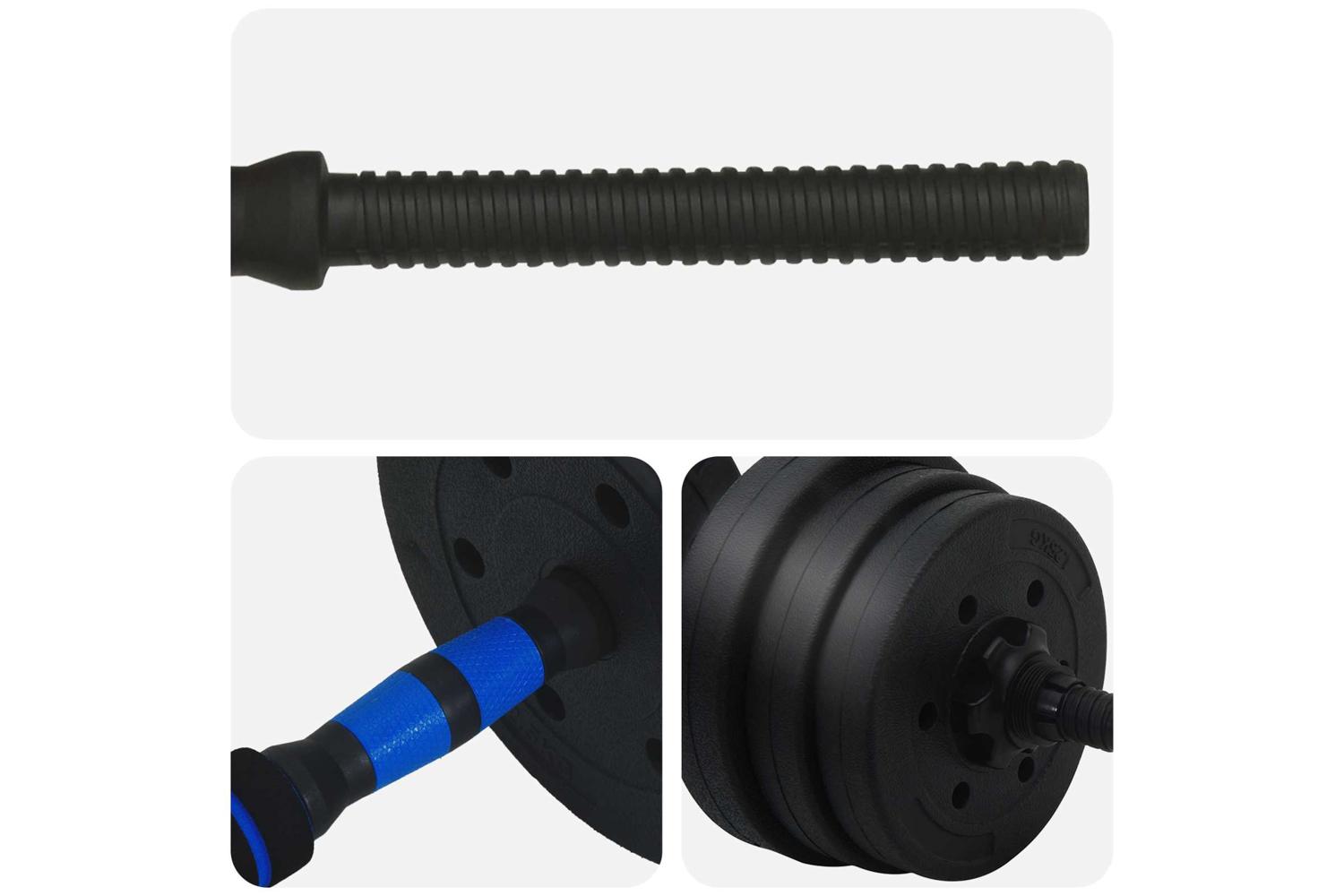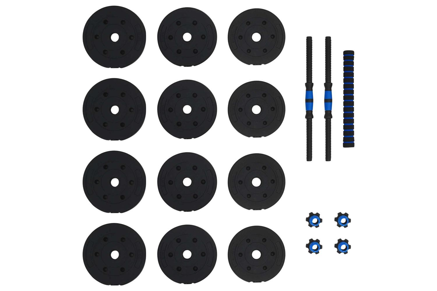 - 4 x Dumbbell plate (1.25 kg): Ø17 x 3 cm (Diameter x T); 4 x Dumbbell plate (1.5 kg): Ø18 x 3.3 cm (Diameter x T); 4 x Dumbbell plate (2 kg): Ø19.5 x 3.8 cm (Diameter x T); 2 x Dumbbell bars (0.27 kg): Ø2.5 x 47 cm (Diameter x L); 1 x Barbell connection pipe: Ø4.15 x 39.5 cm (Diameter x L); 4 x Big star locks