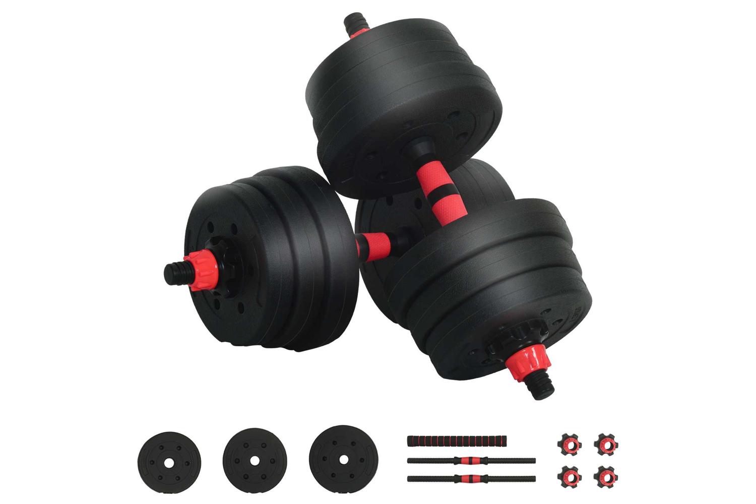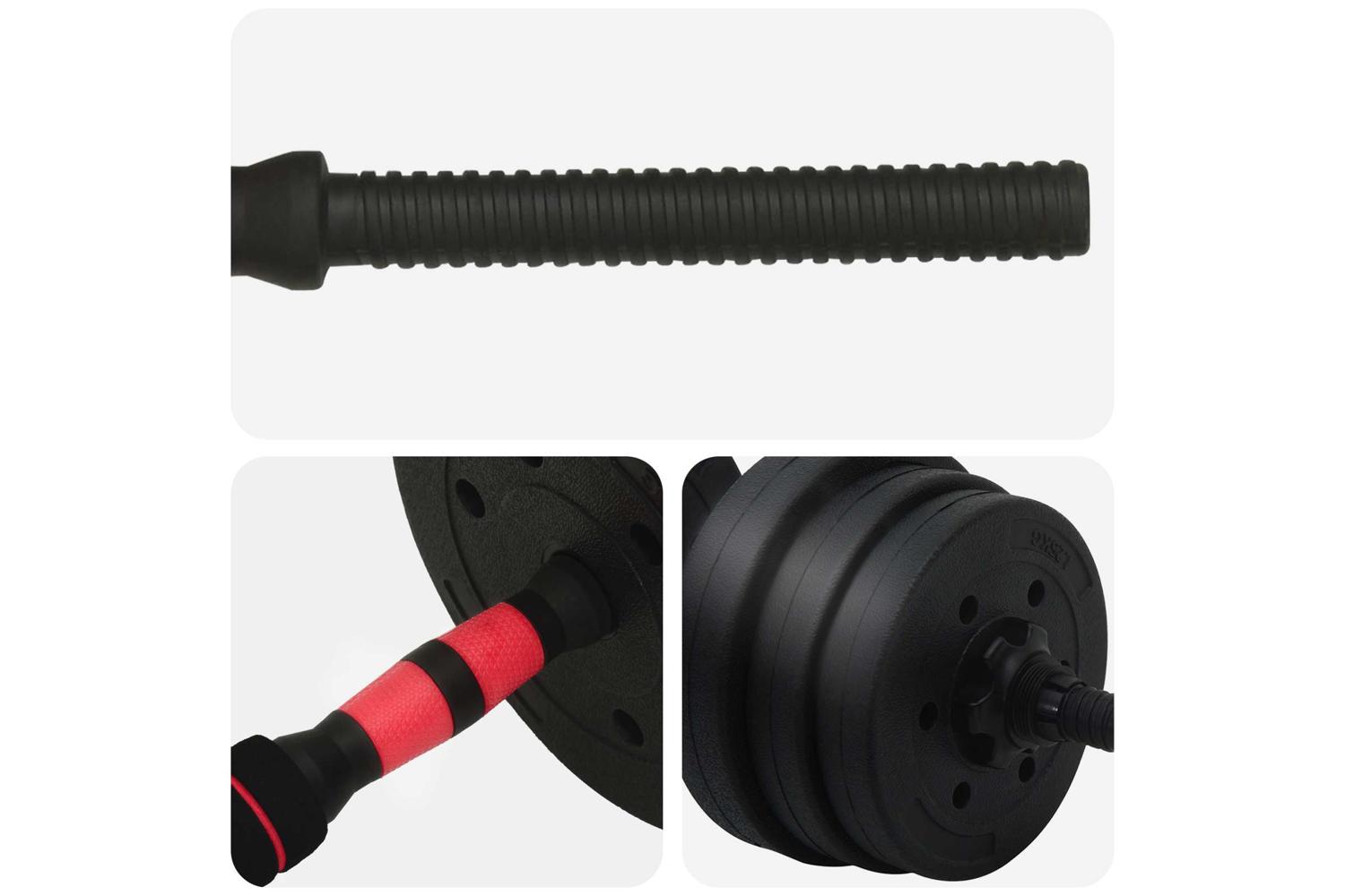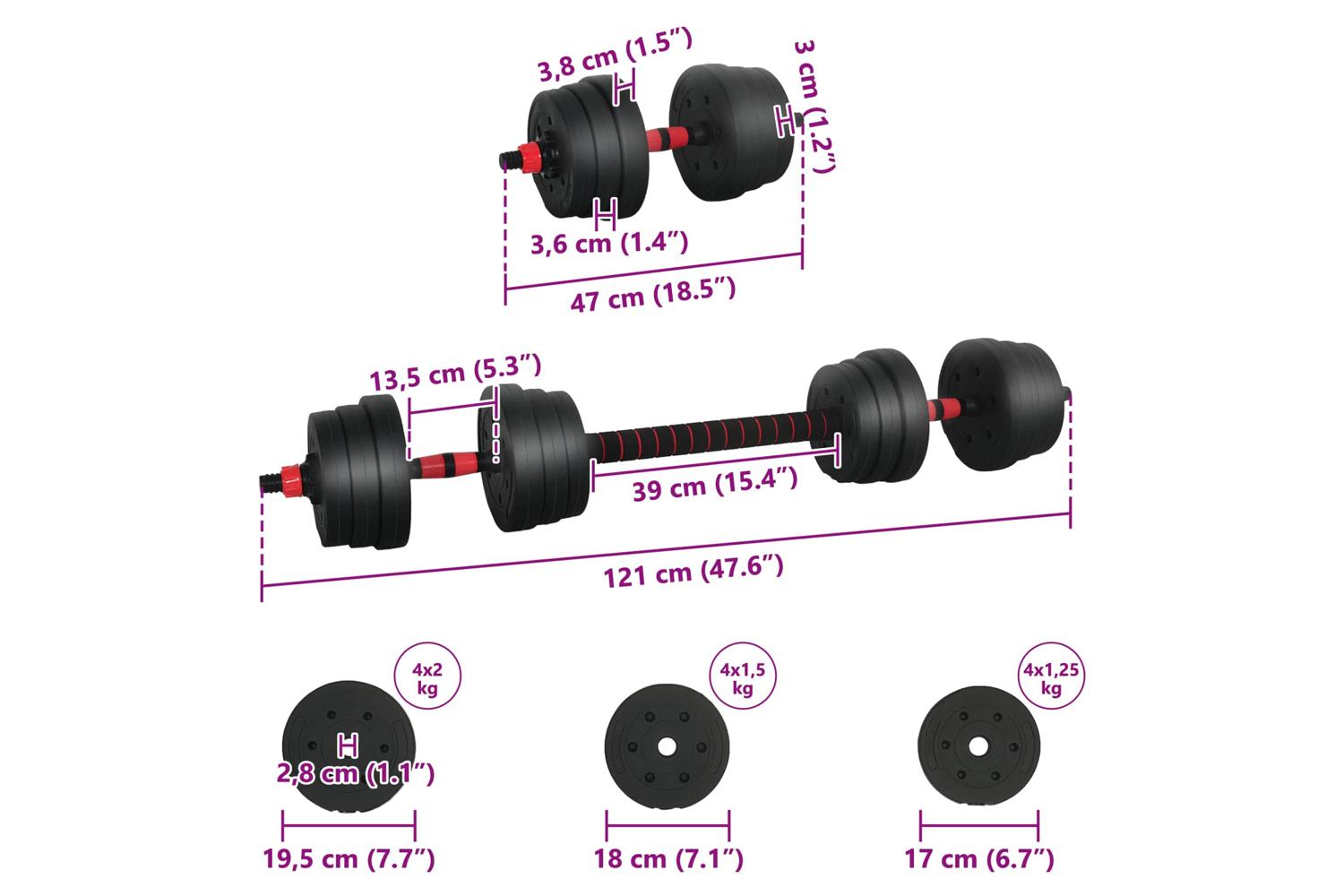 - 4 x Dumbbell plate (1.25 kg): Ø17 x 3 cm (Diameter x T); 4 x Dumbbell plate (1.5 kg): Ø18 x 3.3 cm (Diameter x T); 4 x Dumbbell plate (2 kg): Ø19.5 x 3.8 cm (Diameter x T); 2 x Dumbbell bars (0.27 kg): Ø2.5 x 47 cm (Diameter x L); 1 x Barbell connection pipe: Ø4.15 x 39.5 cm (Diameter x L); 4 x Big star locks