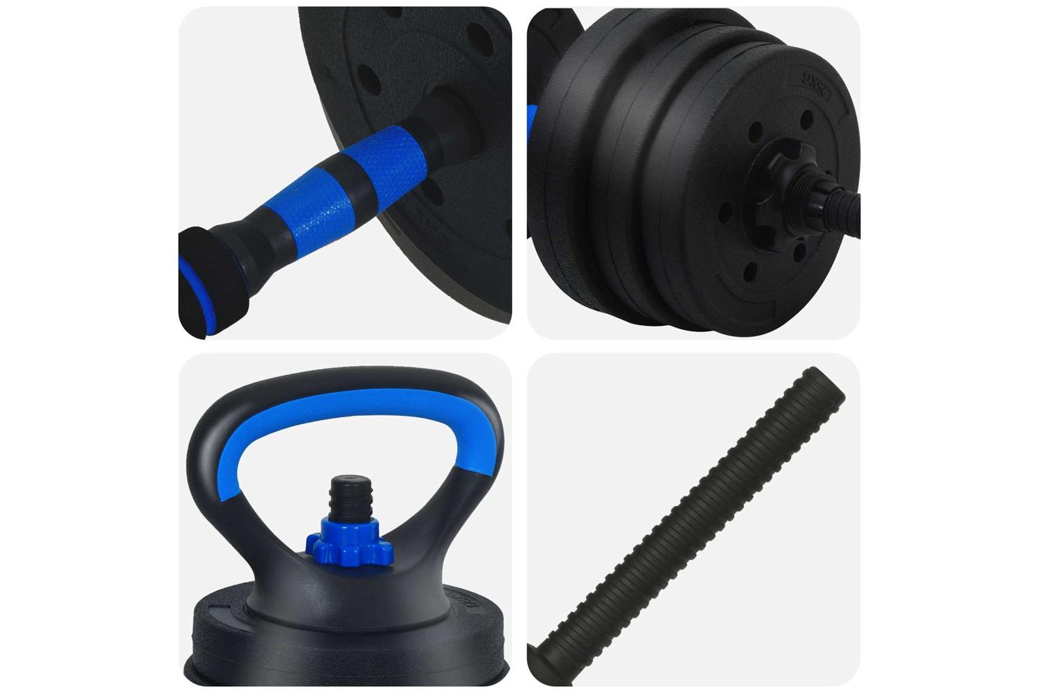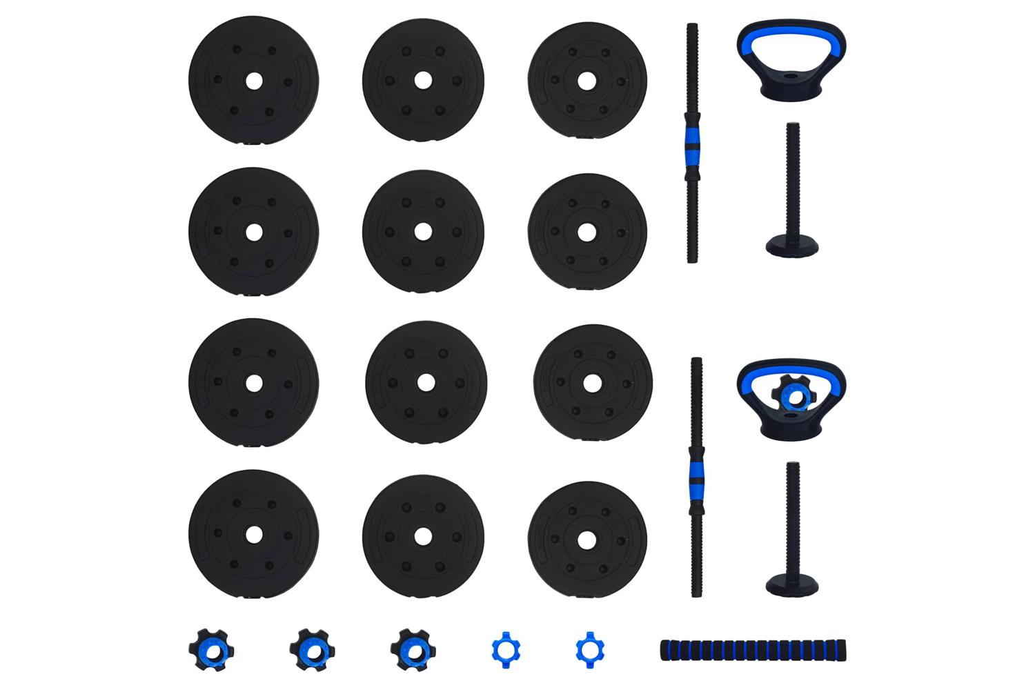 - 4 x Dumbbell plate (1.25 kg): Ø17 x 3 cm (Diameter x T); 4 x Dumbbell plate (1.5 kg): Ø18 x 3.3 cm (Diameter x T); 4 x Dumbbell plate (2 kg): Ø19.5 x 3.8 cm (Diameter x T); 2 x Dumbbell bars (0.27 kg): Ø2.5 x 47 cm (Diameter x L); 1 x Barbell connection pipe: Ø4.15 x 39.5 cm (Diameter x L); 4 x Big star locks; 2 x Kettlebell grip handle: 19.5 x 14 cm (L x H); 2 x Kettlebell base: Ø9.35 x 22 cm (Diameter x H)