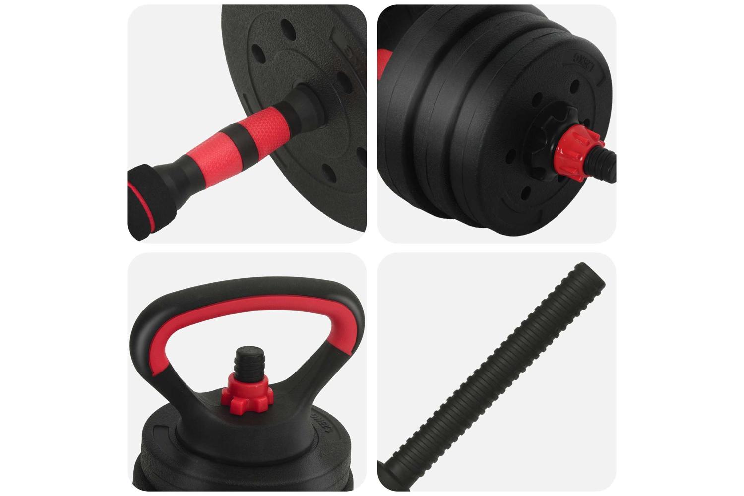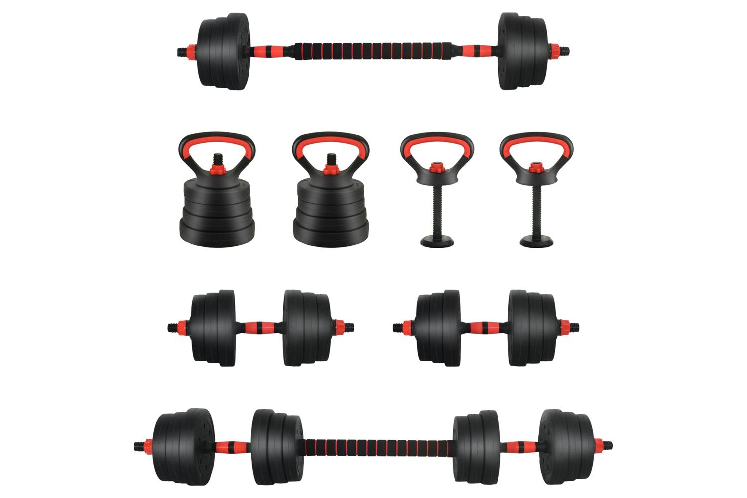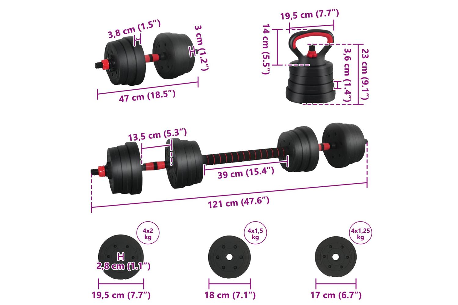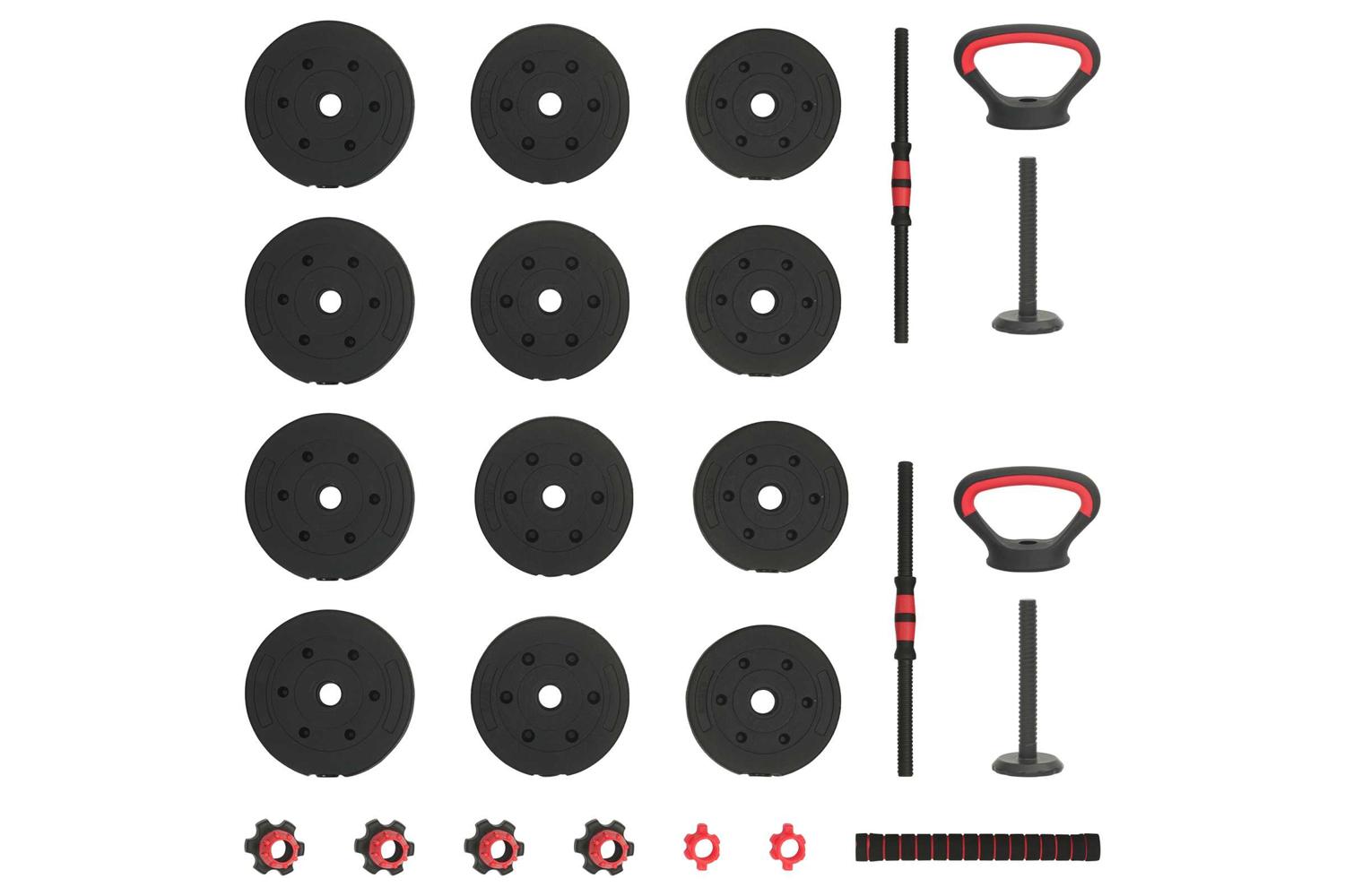 - 4 x Dumbbell plate (1.25 kg): Ø17 x 3 cm (Diameter x T); 4 x Dumbbell plate (1.5 kg): Ø18 x 3.3 cm (Diameter x T); 4 x Dumbbell plate (2 kg): Ø19.5 x 3.8 cm (Diameter x T); 2 x Dumbbell bars (0.27 kg): Ø2.5 x 47 cm (Diameter x L); 1 x Barbell connection pipe: Ø4.15 x 39.5 cm (Diameter x L); 4 x Big star locks; 2 x Kettlebell grip handle: 19.5 x 14 cm (L x H); 2 x Kettlebell base: Ø9.35 x 22 cm (Diameter x H)
