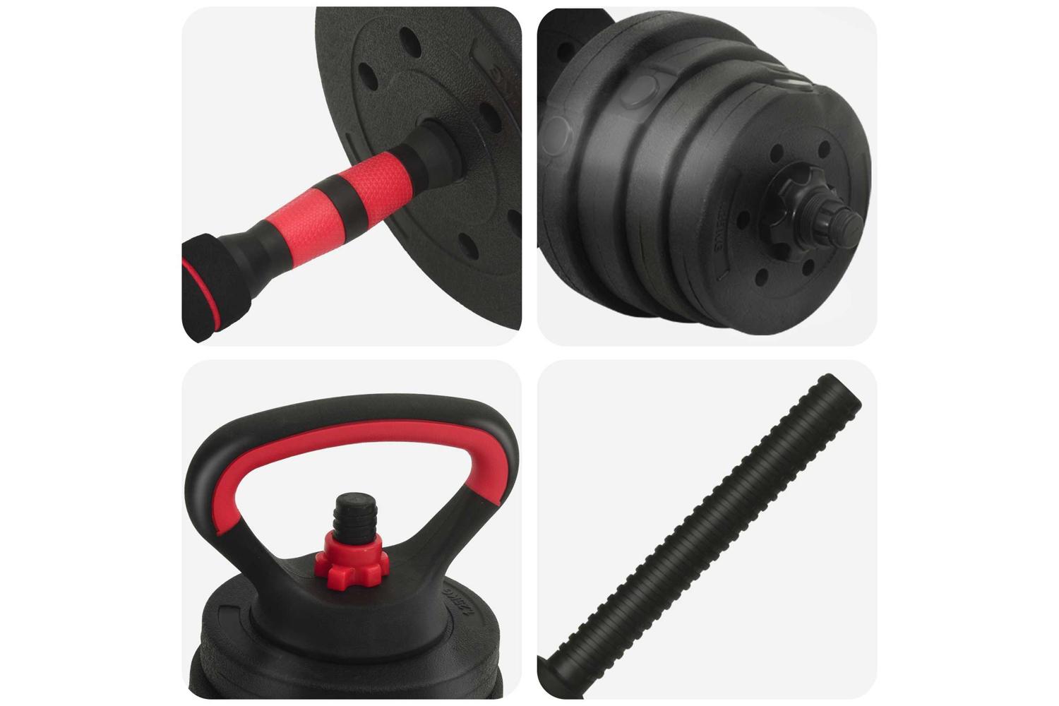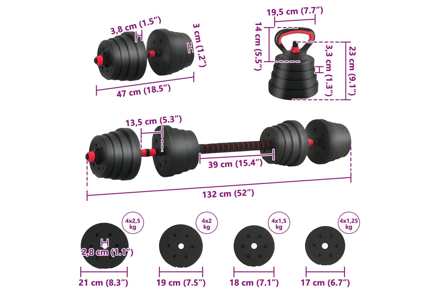 - 4 x Dumbbell plate (1.25 kg): Ø17 x 3 cm (Diameter x T); 4 x Dumbbell plate (1.5 kg): Ø18 x 3.3 cm (Diameter x T); 4 x Dumbbell plate (2 kg): Ø19 x 3.8 cm (Diameter x T); 4 x Dumbbell plate (2.5 kg): Ø21 x 3.8 cm (Diameter x T); 2 x Dumbbell bars (0.27 kg): Ø2.5 x 51 cm (Diameter x L); 1 x Barbell connection pipe: Ø4.15 x 39,5 cm (Diameter x L); 4 x Big star locks; 2 x Kettlebell grip handle: 19.5 x 14 cm (L x H); 2 x Kettlebell base: Ø9.35 x 22 cm (Diameter x H)
