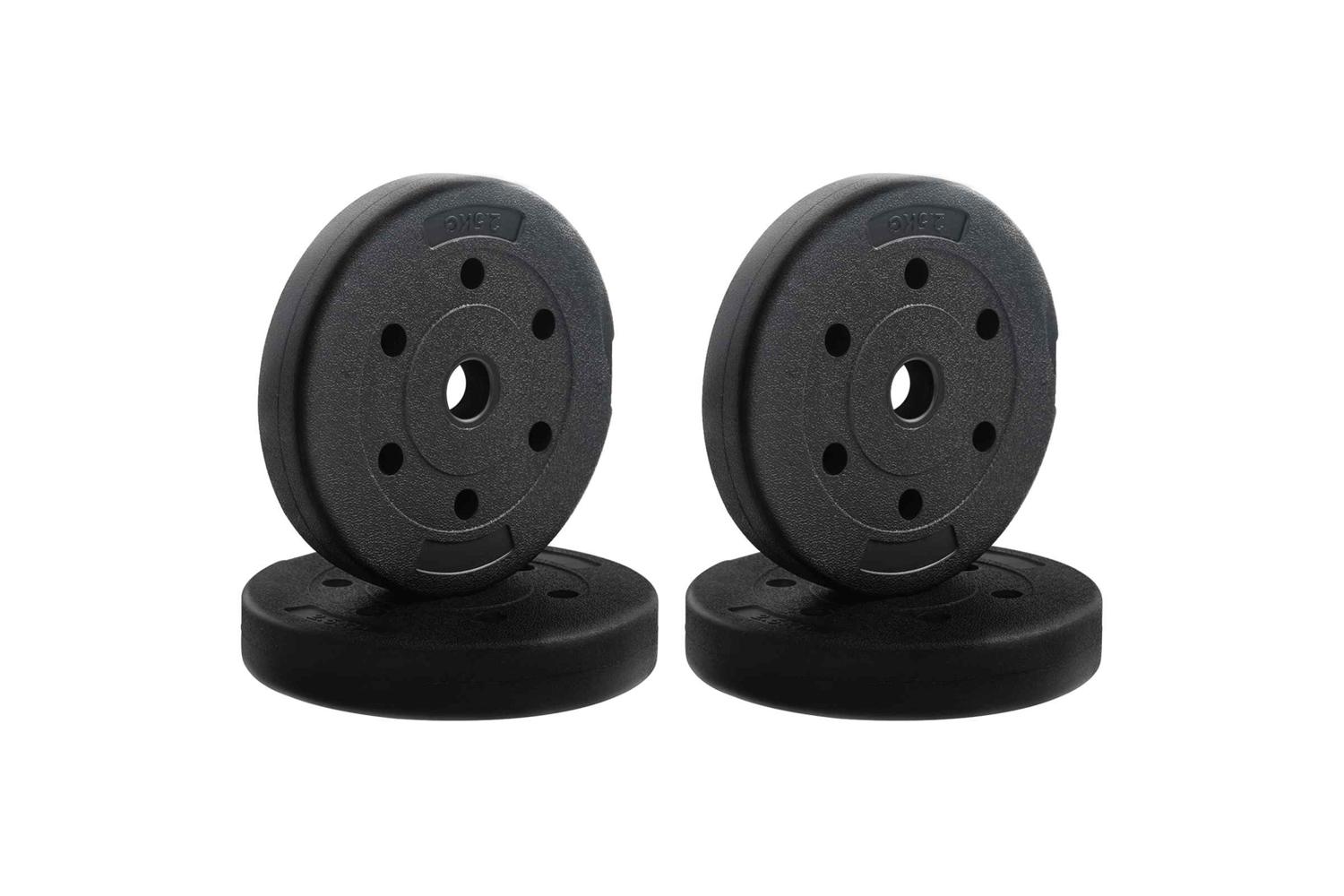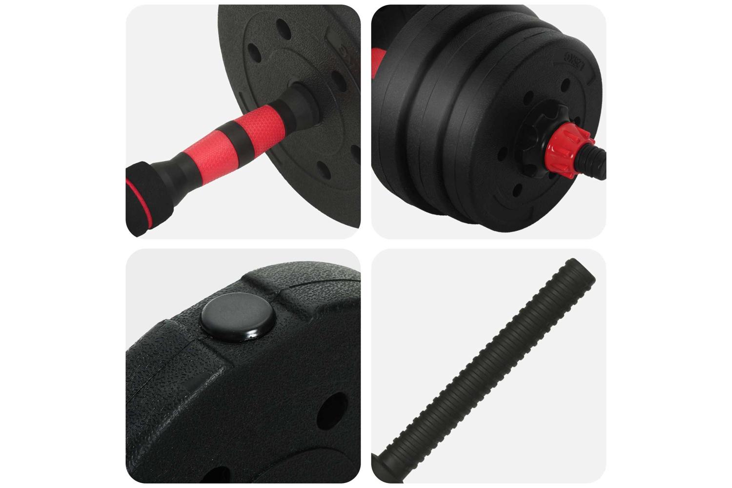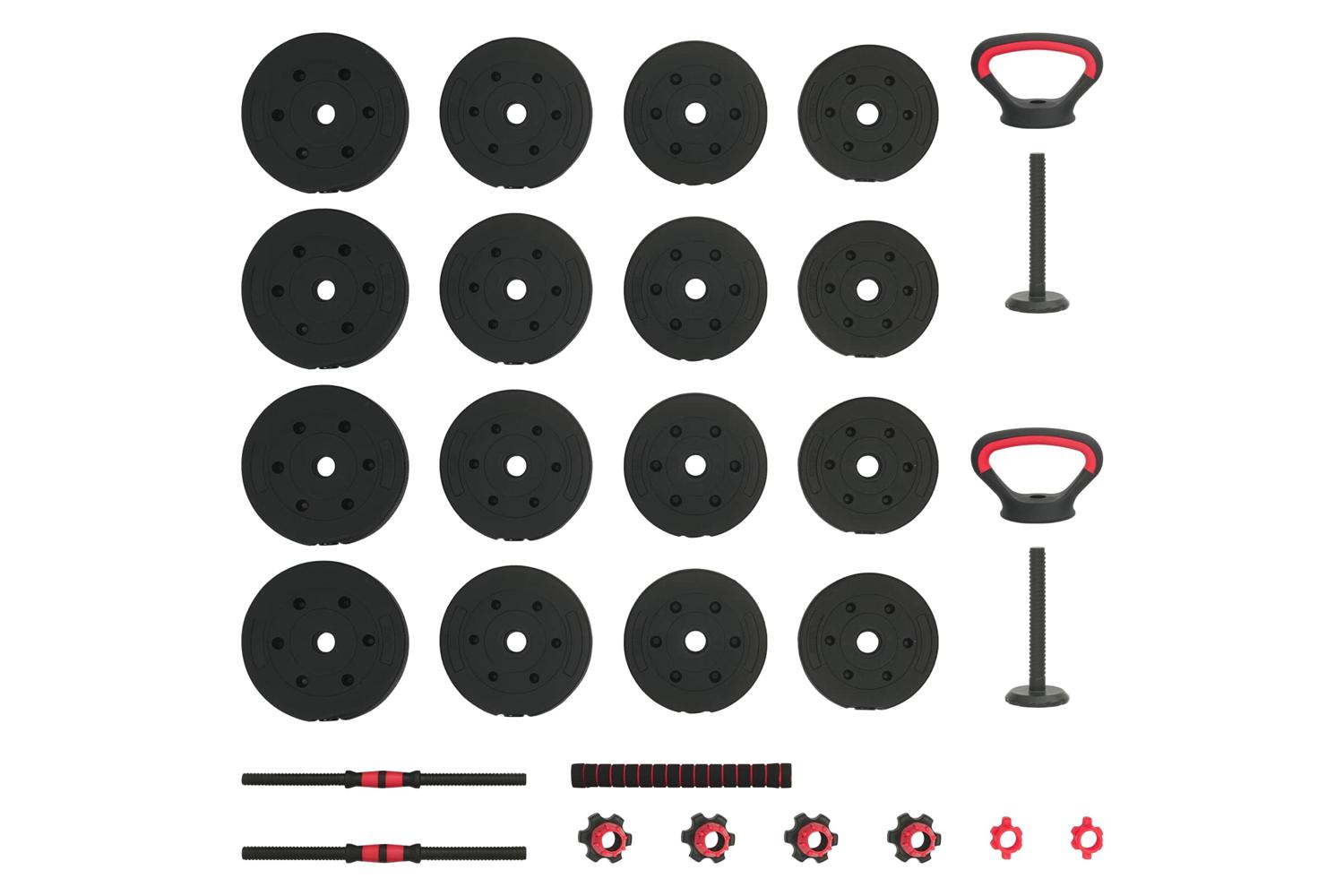 - 4 x Dumbbell plate (1.25 kg): Ø17 x 3 cm (Diameter x T); 4 x Dumbbell plate (1.5 kg): Ø18 x 3.3 cm (Diameter x T); 4 x Dumbbell plate (2 kg): Ø19 x 3.8 cm (Diameter x T); 4 x Dumbbell plate (2.5 kg): Ø21 x 3.8 cm (Diameter x T); 2 x Dumbbell bars (0.27 kg): Ø2.5 x 51 cm (Diameter x L); 1 x Barbell connection pipe: Ø4.15 x 39.5 cm (Diameter x L); 2 x Kettlebell grip handle: 19.5 x 14 cm (L x H); 2 x Kettlebell base: Ø9.35 x 22 cm (Diameter x H); 2 x Small star locks
