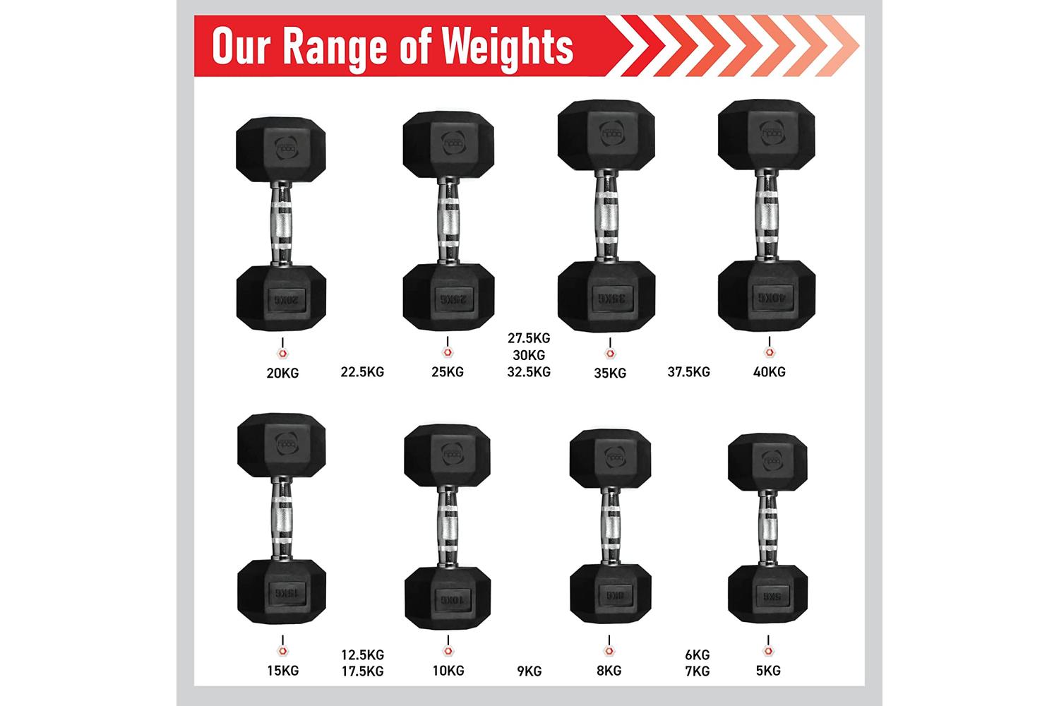 Monstershop hexagonal-shaped rubber-coated dumbbells are the ideal companion for your fitness journey. Whether you plan to focus on strength training, endurance or building muscle, have the right dumbbells for you. Choose between singles or sets in the dropdown