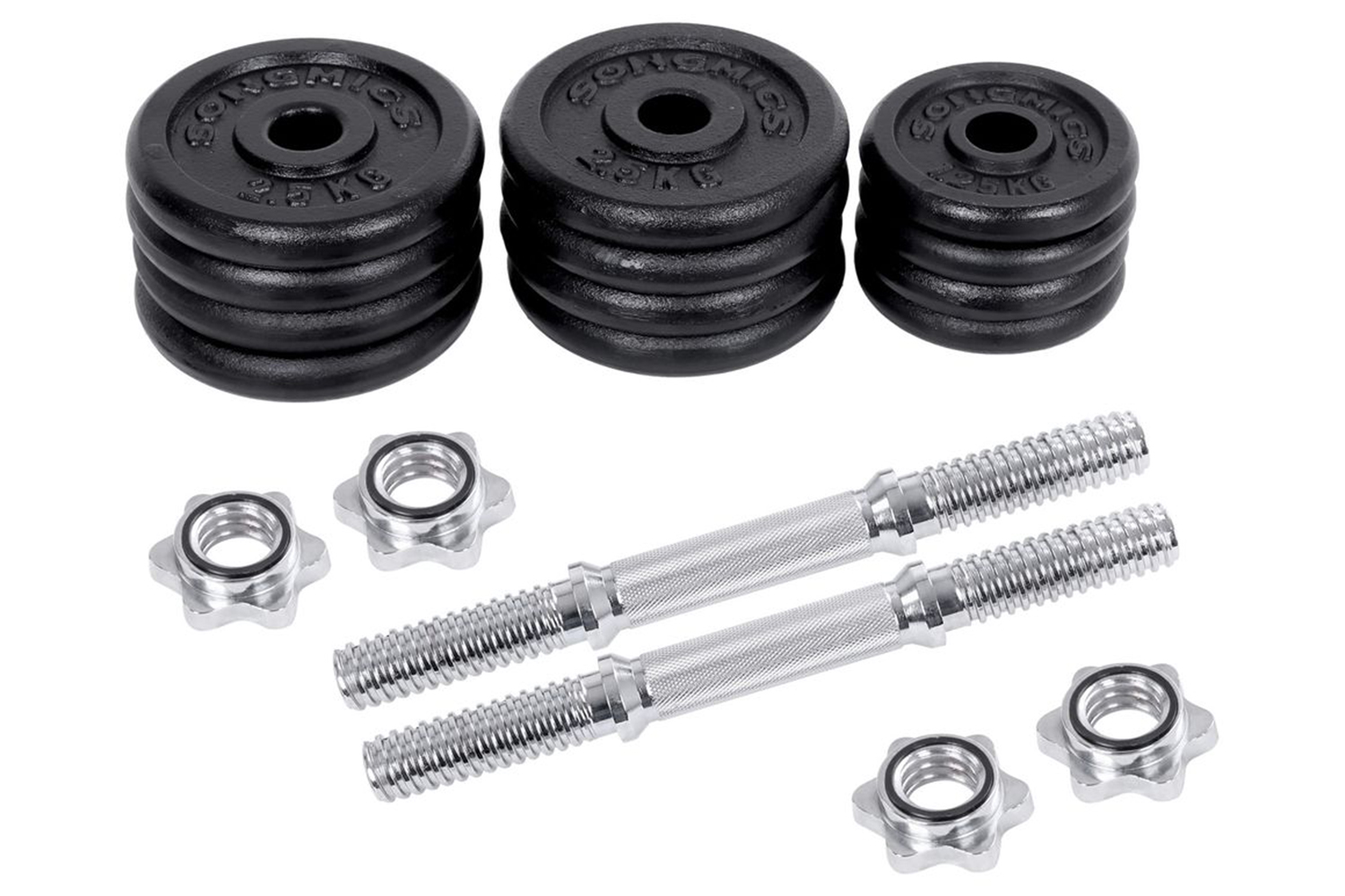30 kg (2 x 15 kg set) = 8 x 2.5 kg, 4 x 1.25 kg, 2 x barbells and 4 x star screw caps