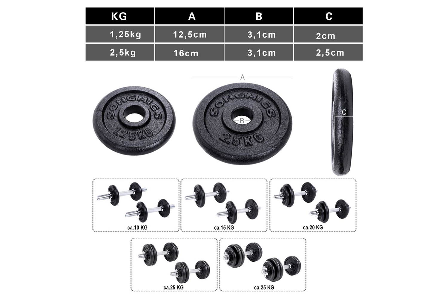 the weight discs can be freely combined and easily increased or reduced (you can set the weights of 10, 15, 20, 25 and 30 kg as you wish).