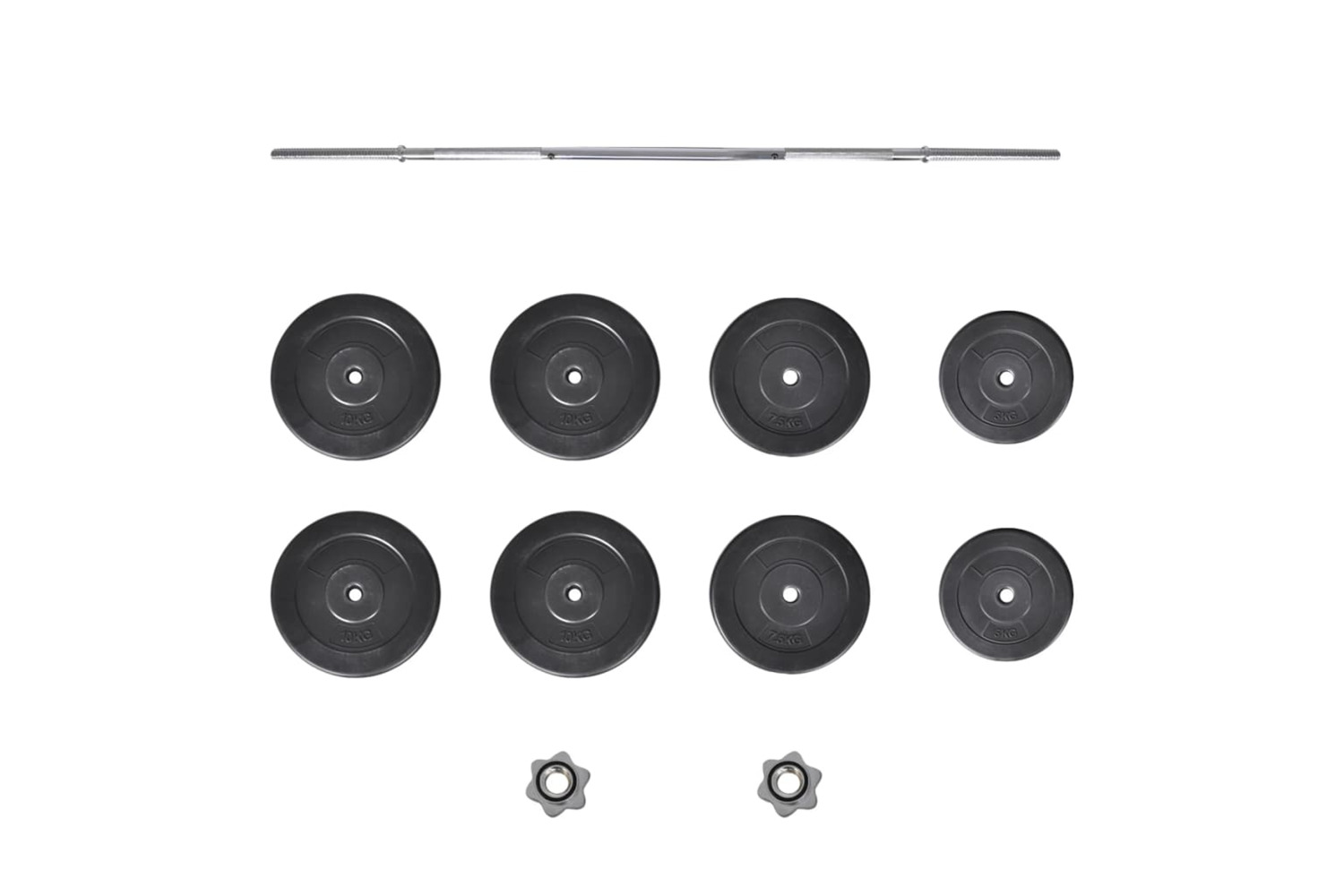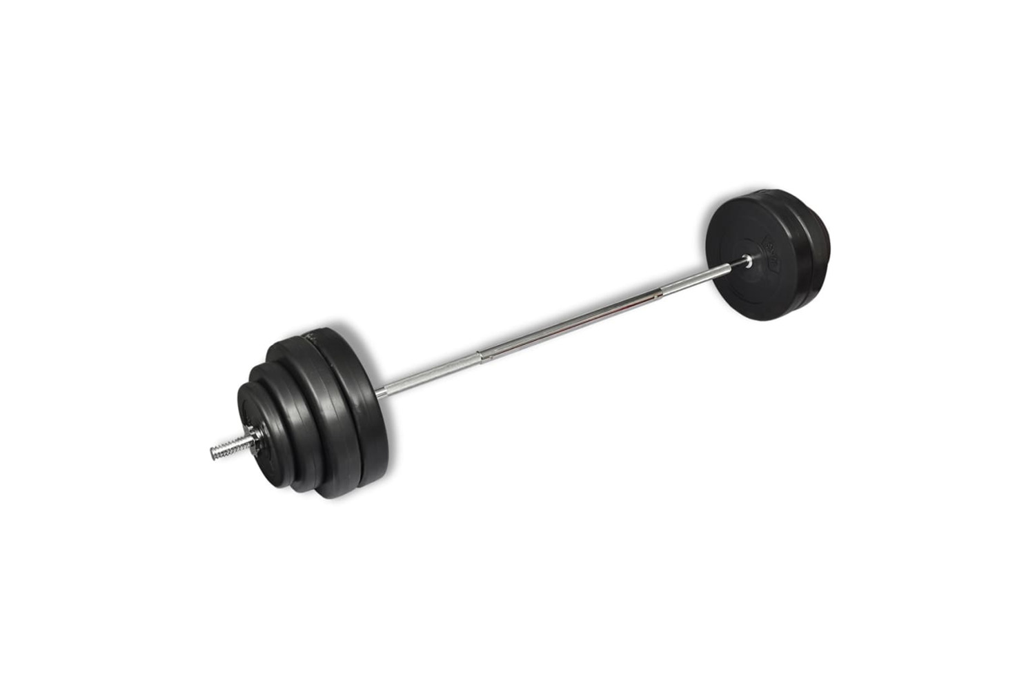 The length of the straight bar is 165 cm. Therefore you can also use it in combination with our other dumbbell sets. A suitable combination is easily made with the 8 different weights, 4 x 10 kg, 2 x 5 kg and 2 x 2 kg.
