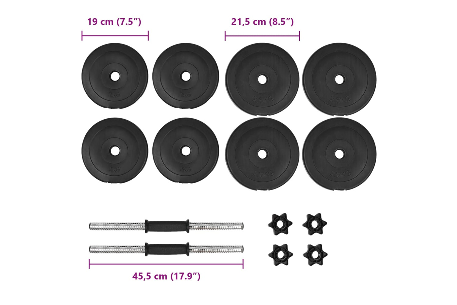 - Dumbbell bar dimensions: 2.5 x 45 cm (Diameter x L)