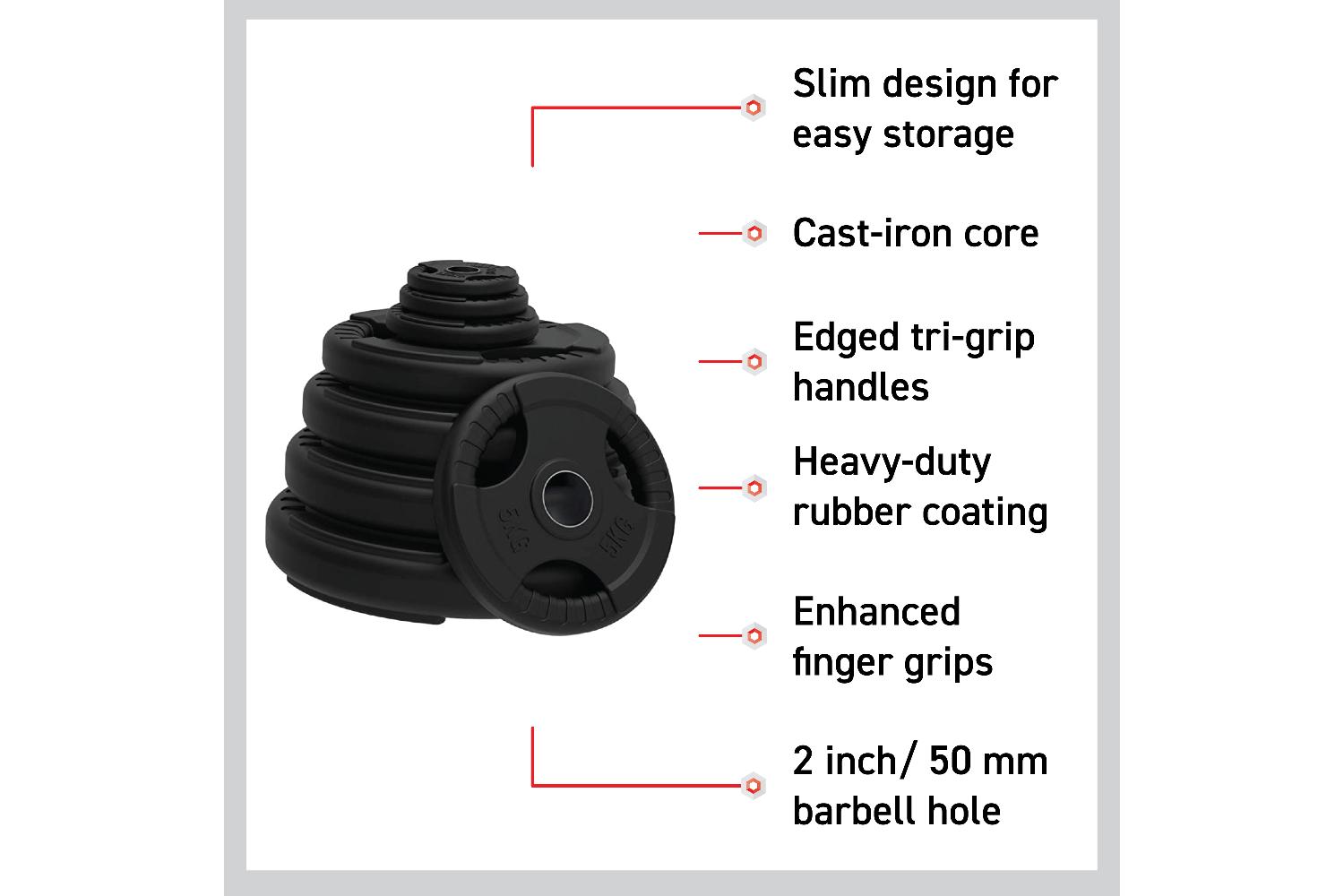 - Durable cast iron Olympic weight plates covered with heavy-duty rubber