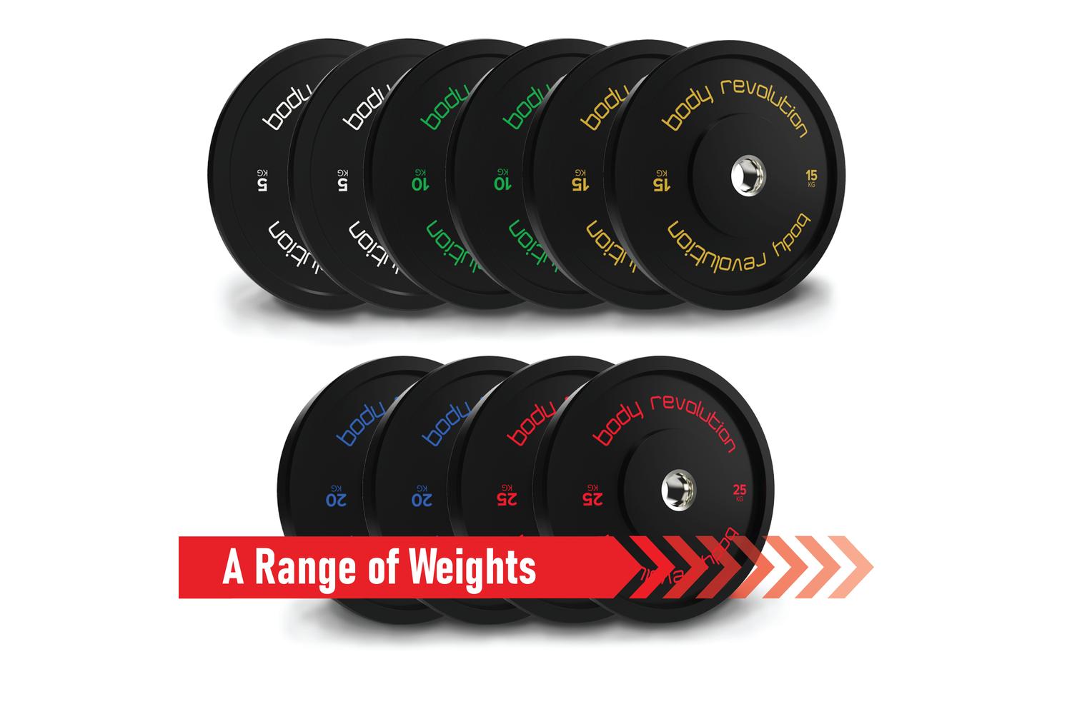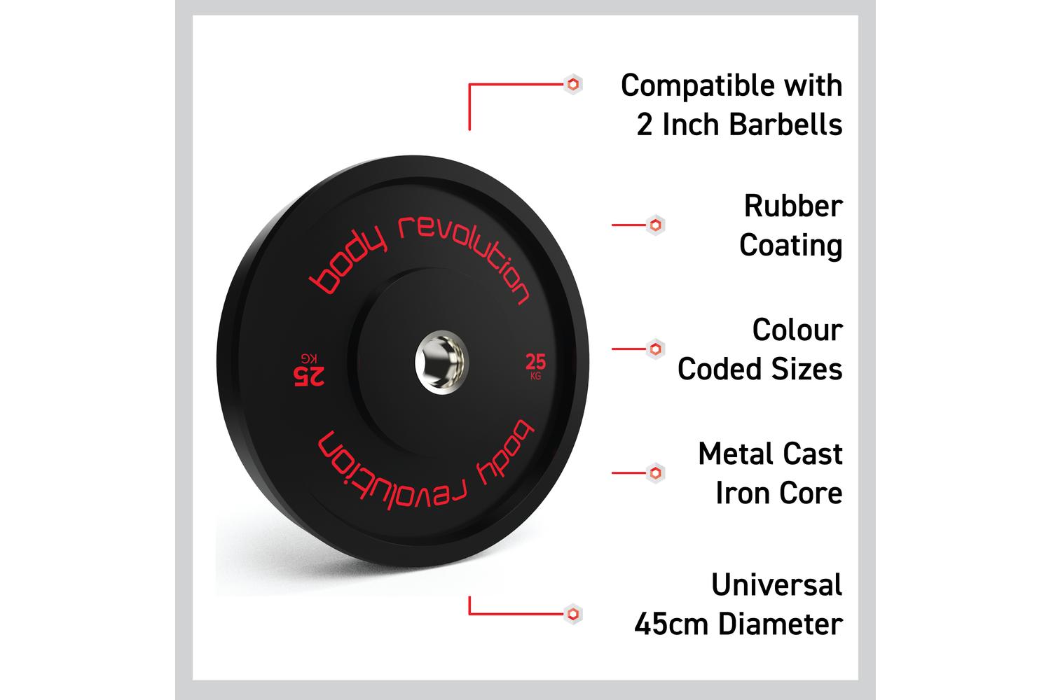 Our Body Revolution Olympic Bumper Plates are expertly designed to withstand high-repetitive usage, equipping you to train harder and longer. Plus, their damage-minimising heavy-duty rubber coat safeguards not only you but also your floor and the weight plates themselves. Moreover, our bumper plates stand out for their universal diameter that fosters even weight distribution, thus helping to prevent any jerking during your workout routines.