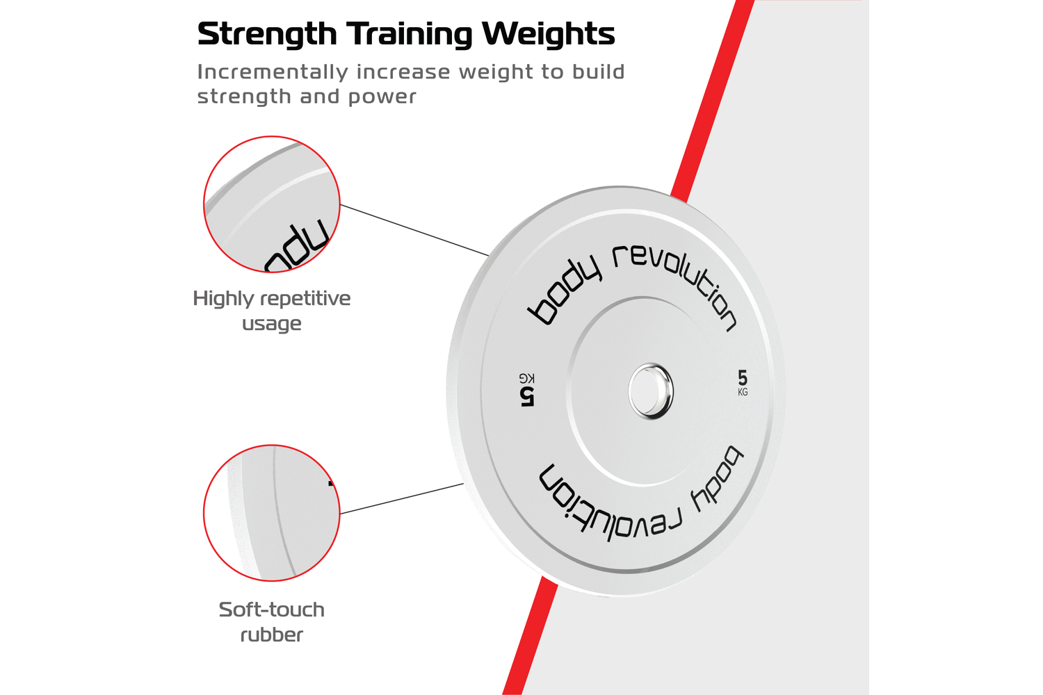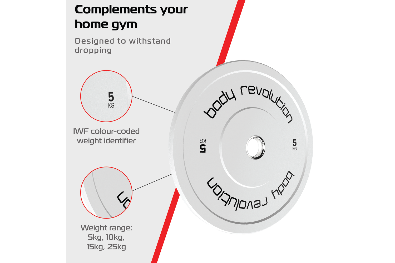 Our Body Revolution Olympic Bumper Plates come in a sleek, slim design, optimized with a stainless-steel inner ring so you can stack as much as you need on your trusty Olympic barbell. This means enhanced load capacity for leaps in strength and muscle mass. They are equipped with a 2-inch (50mm) barbell hole, accommodating your Olympic bar with ease. Additionally, these Hope-Irish plates stay true to International Weightlifting Federation (IWF) standards with a comprehensive colour-coding system based on weight - available in 5kg, 10kg, 15kg, 20kg, and 25kg variants.