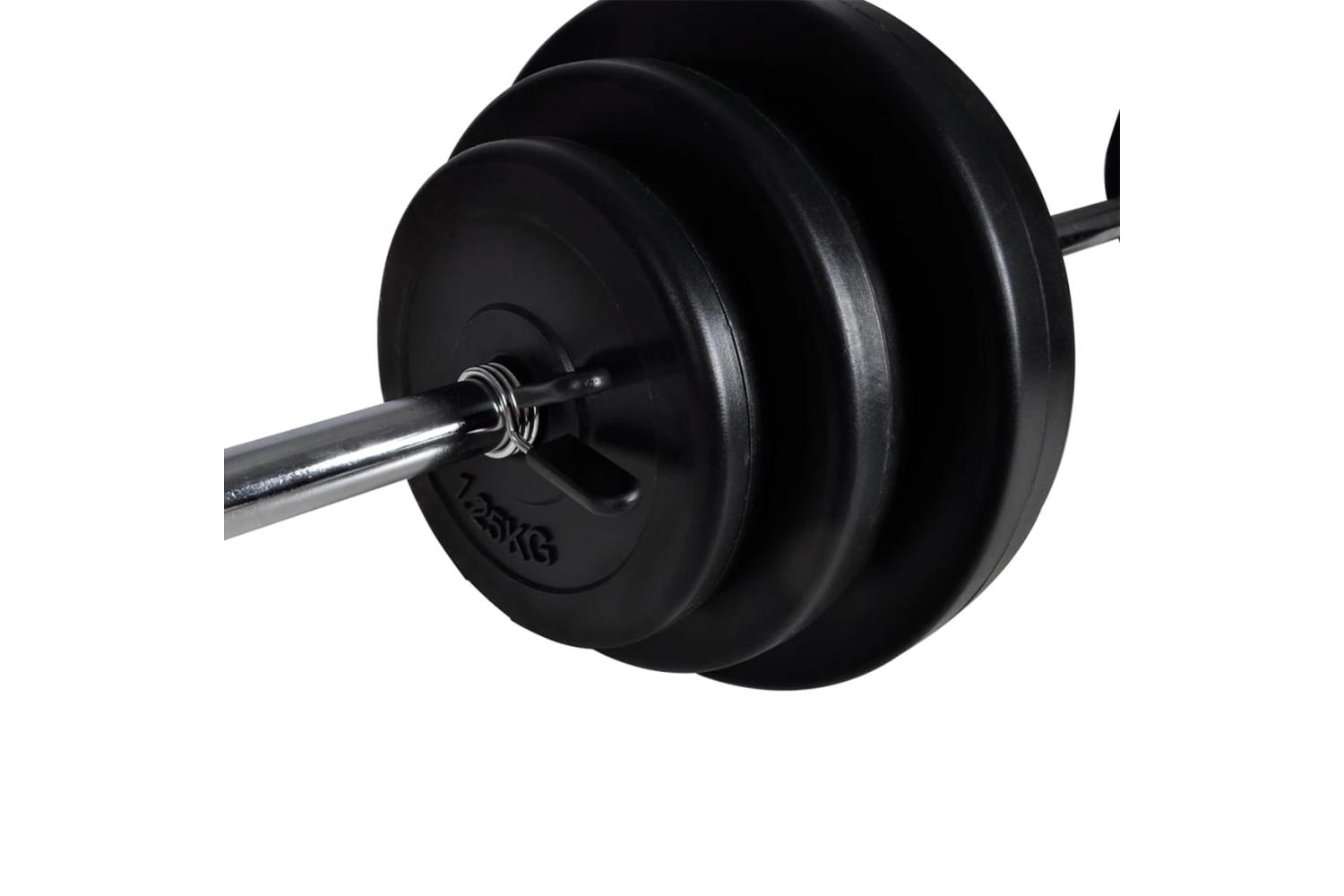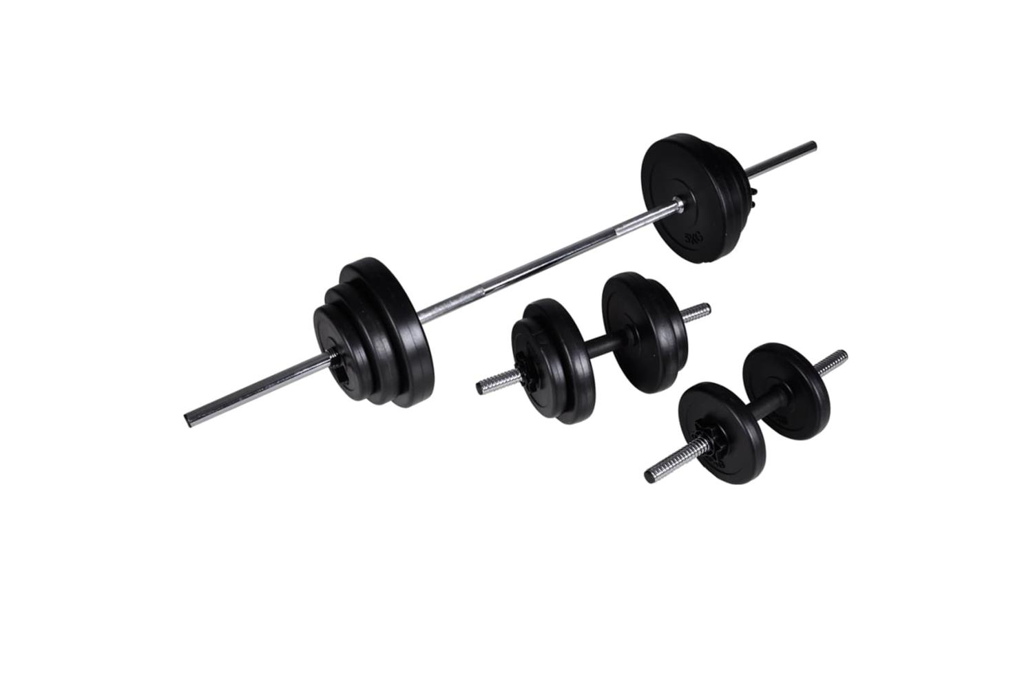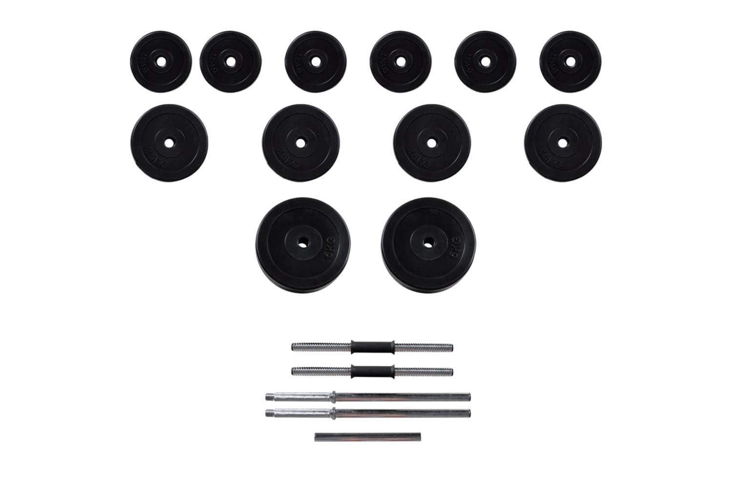 The barbell and dumbbell set features solid chrome-plated bars with quick-action spring collars (for barbell bar), non-slip knurled grips, and fluted star-screw caps (for dumbbell bars) for secure attachment of the weight plates. You can work out without worrying about safety issues. The weight plates are made with a robust polyethylene casing. They can be combined in various ways for different training purposes.
