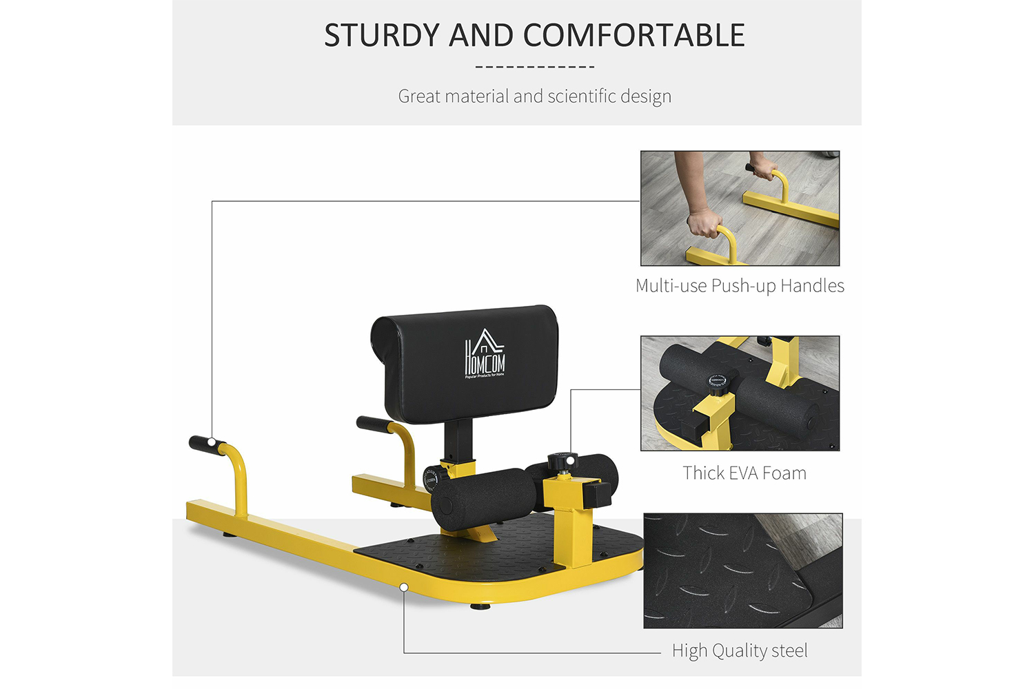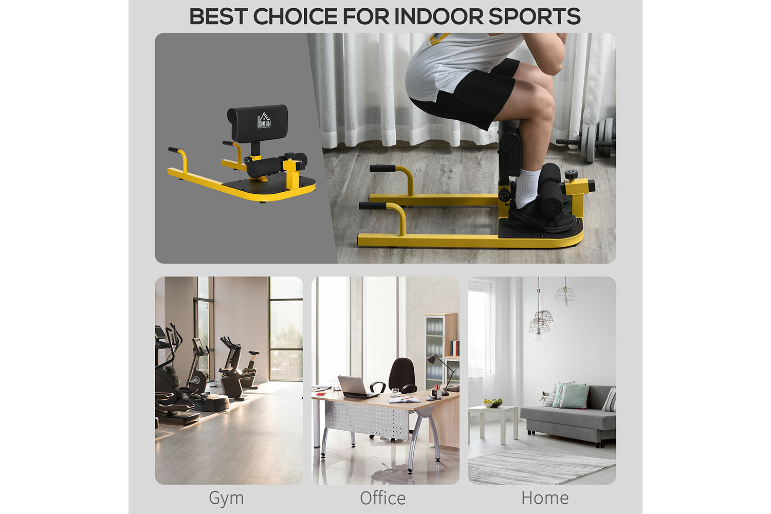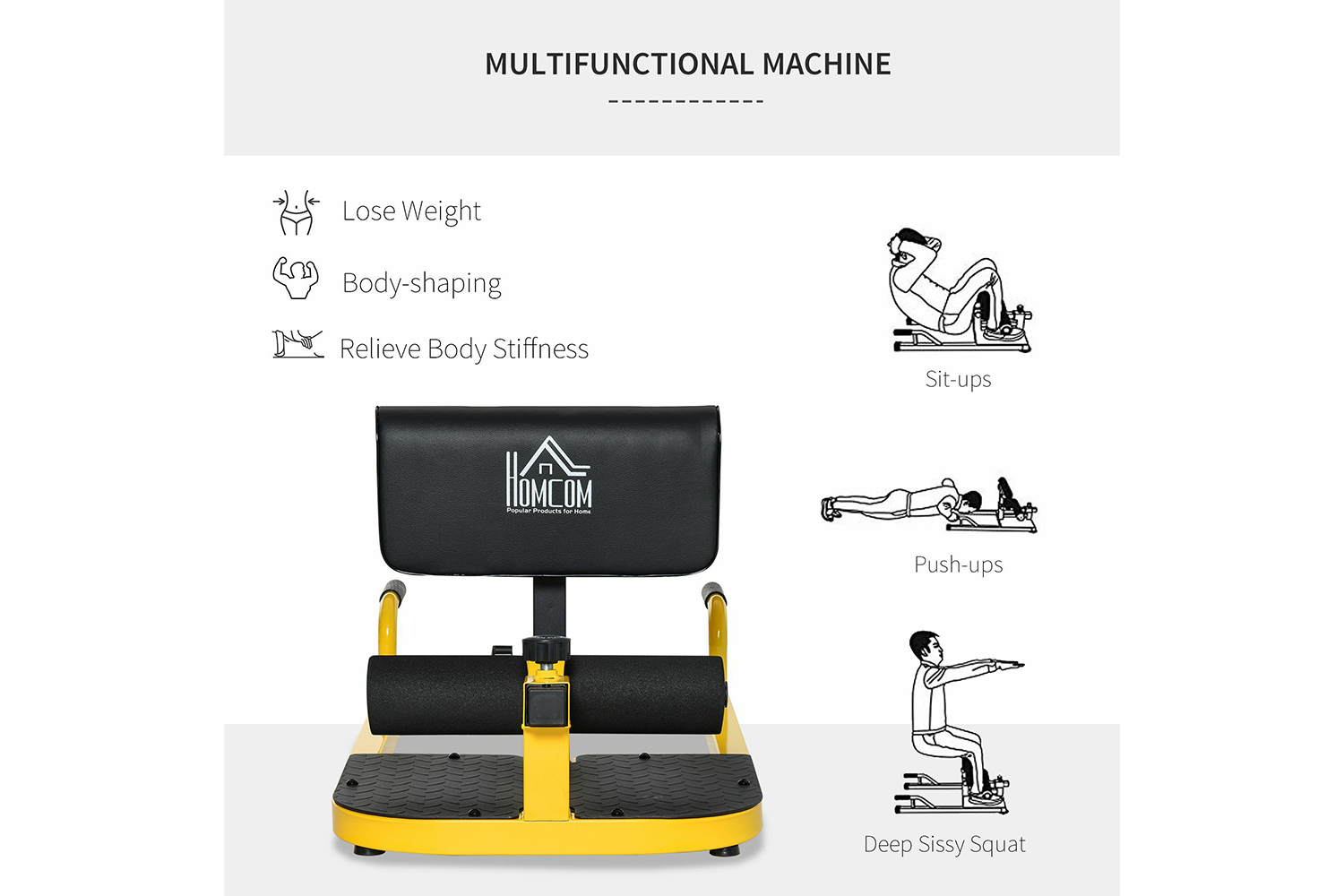If you've been looking for a way to boost your leg day, it's time to add this Sissy Squat Machine from Homcom to your home gym. This compact 3-in-1 exercise machine helps you do perfect sissy squats, sit-ups, and push-ups, so you can work your whole body in one workout. Work your quads, glutes, and hamstrings with the stable squat bars by sliding your feet under the rollers and leaning backwards with your calves against the padded calf support bar. You can lay back over the support bar for sit-ups to work your core while the foot rollers keep you safely in place, or use the dual handles at the back of the machine for elevated push-ups and planks to work your entire body. The height adjustable pads make this equipment versatile for all body types. Four suction cups keep the machine securely on the floor while you work out, and two built in wheels make this machine easy to move and store when not in use. Start building your perfect body today with this 3-in-1 squat machine!