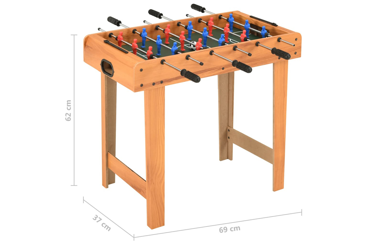 A complete football game table is delivered, including 2 goals, 2 balls, 2 scoreboards, 6 player rods and 18 players.