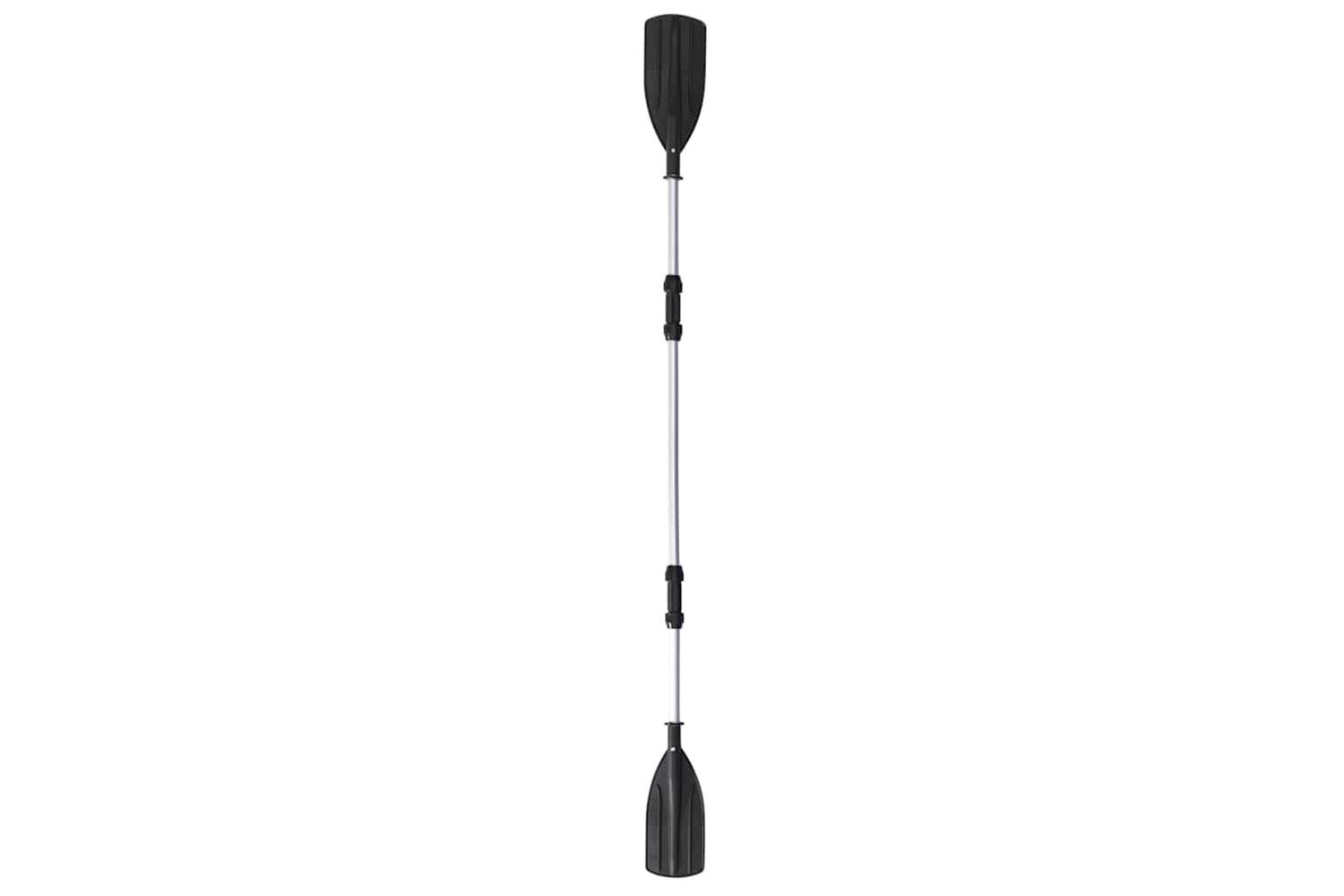 This single-seat kayak, designed with an adjustable backrest for comfort and support, can hold your essentials like protein and water in easily accessible storage compartments. There is also a removable storage bag that allows you to access your necessities when you paddle through the water. The double-bladed oars are aluminium, lightweight, and held flush by secure oar clasps. When fully inflated by the handheld pump, the kayak is 2,8 m long and can carry up to 100 kg. It has sturdy canvas handles on each side, making moving the kayak a breeze. The Ventura Kayak features removable fins to help with directional stability and increase speeds.
