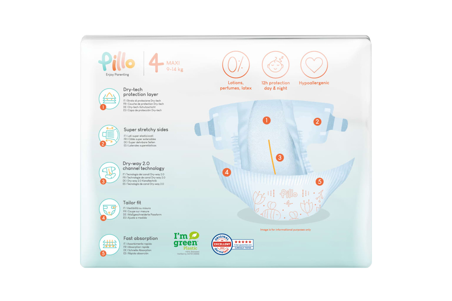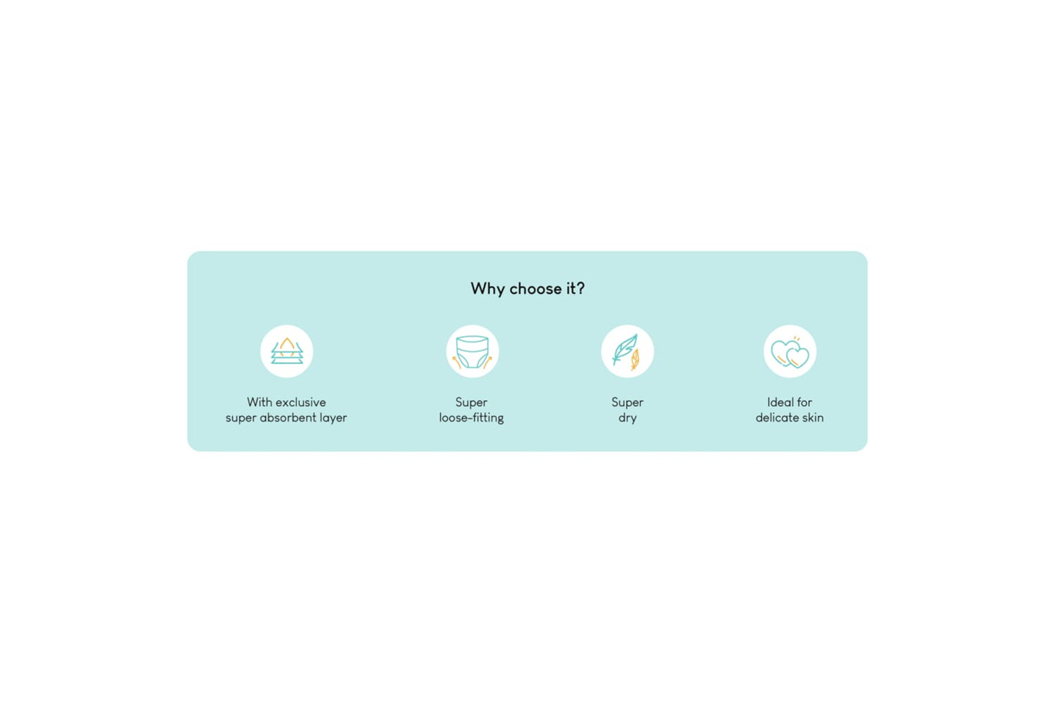 - Day and night protection: The nappy has a super-absorbent layer that absorbs and locks in liquids, giving your baby up to 12 hours of all-around leakage protection.