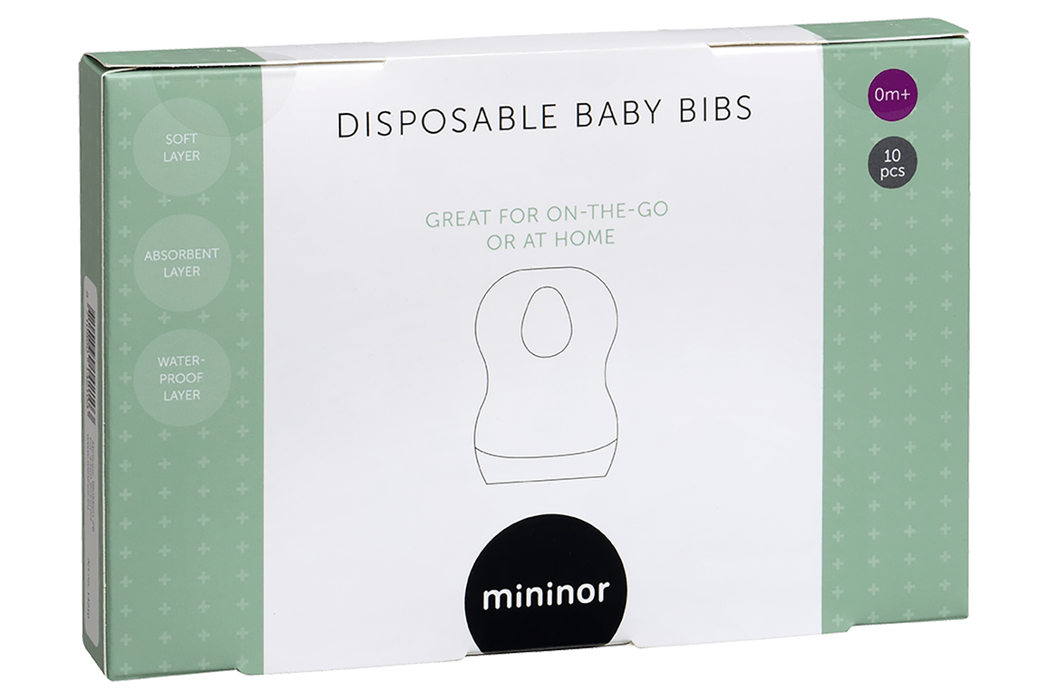 Practical disposable bib for home use or on the go. 10 bibs per package.